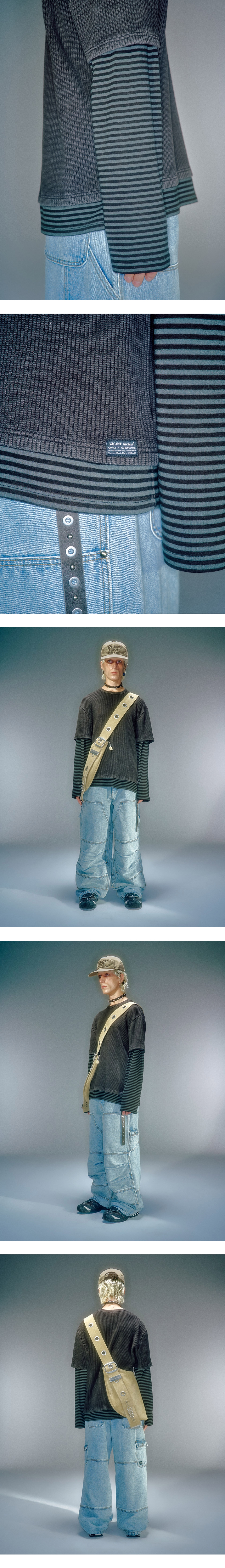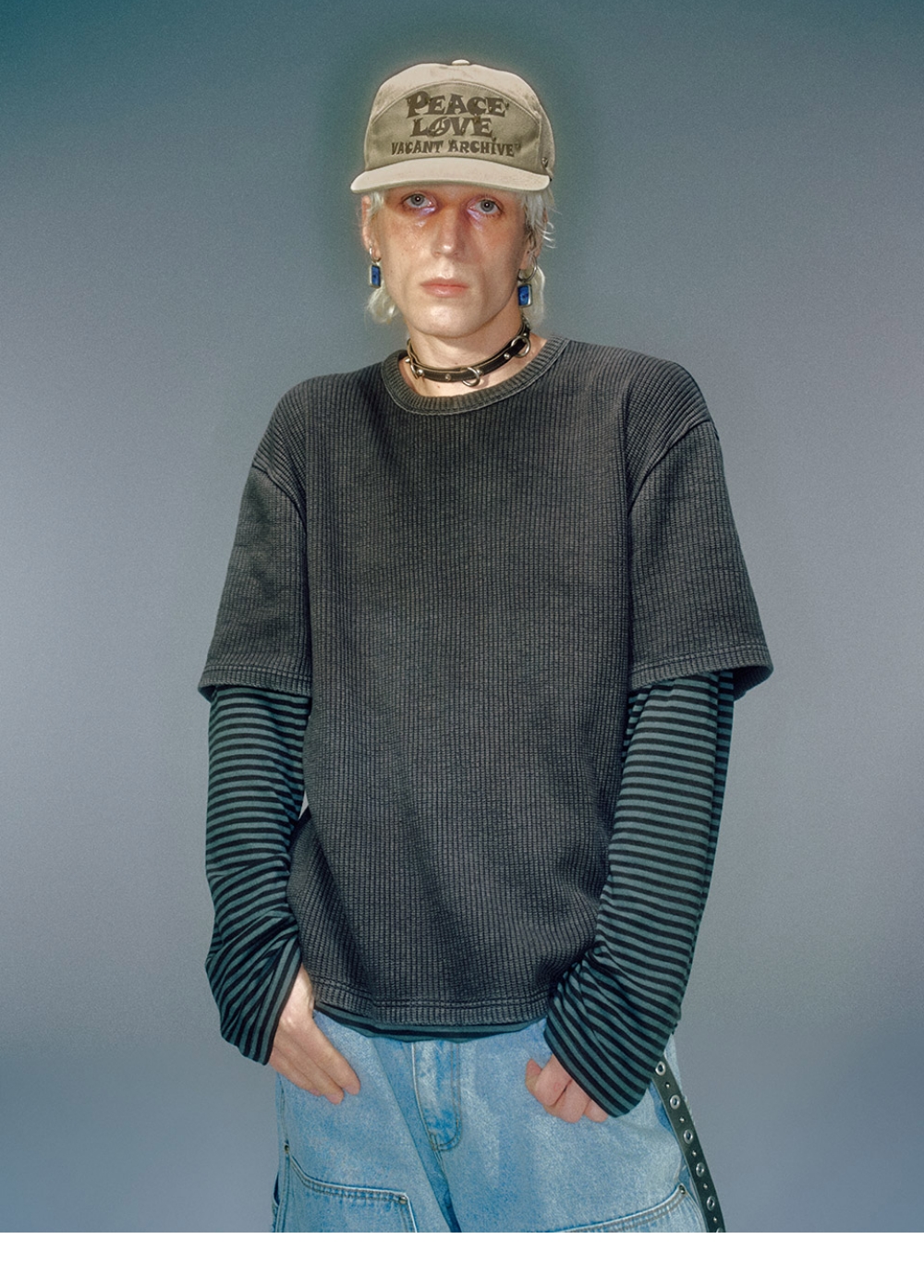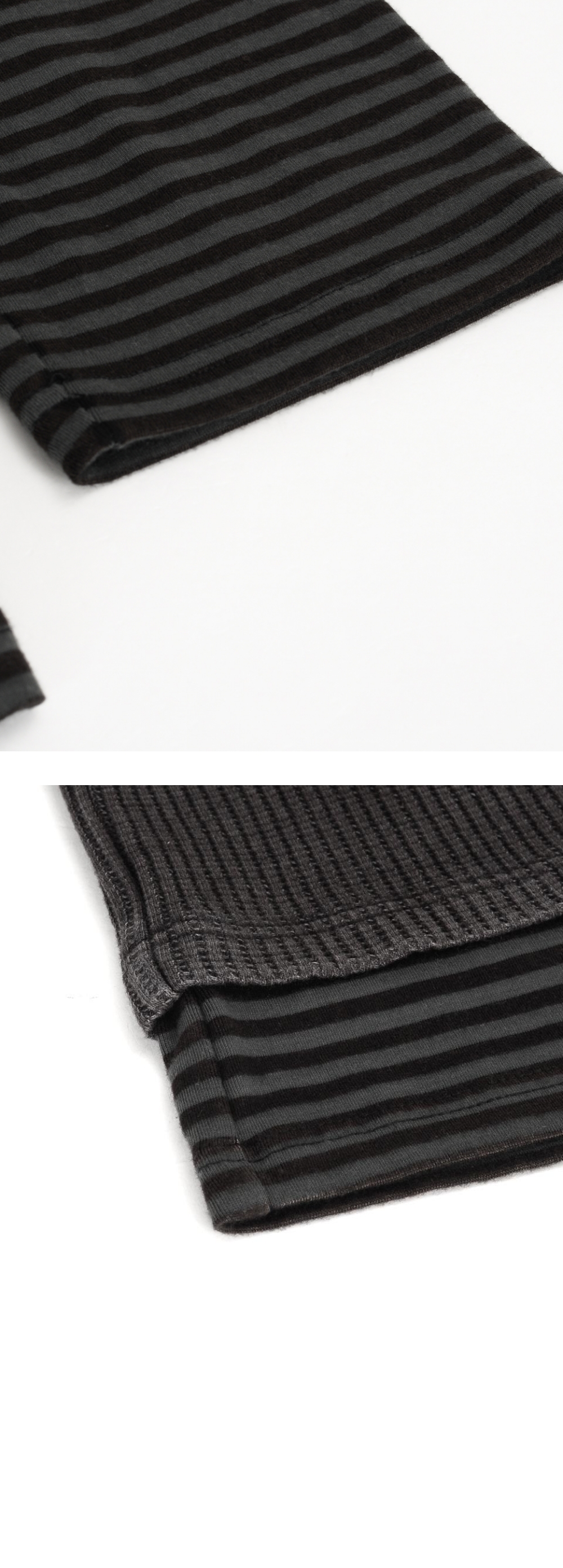와플 형태의 원단과 스트라이프 스타일의 원단 레이어드 디자인 밑단부분 베이컨트 워크웨어라벨 디테일 빈티지 워싱 가공