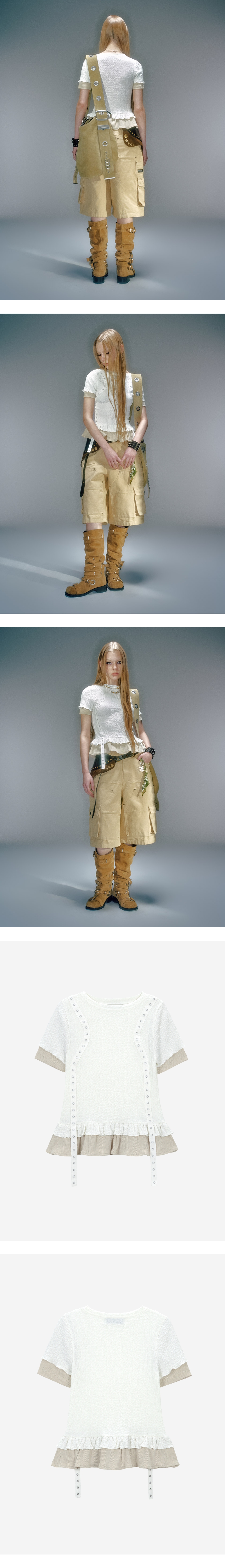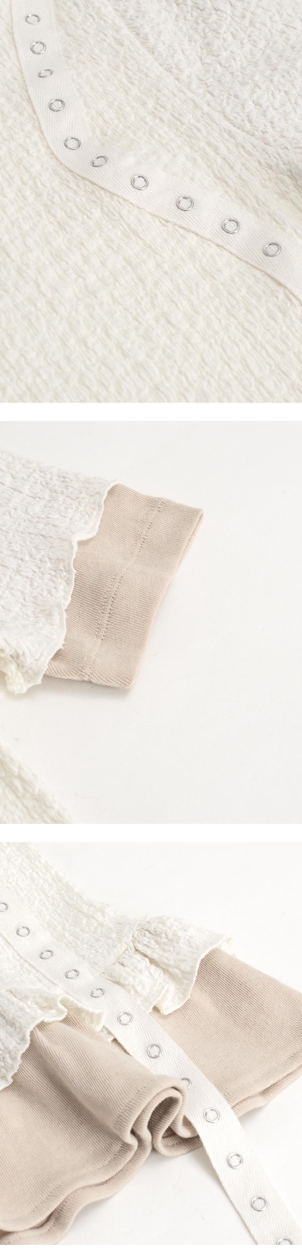 2가지 원단이 한겹으로 이루어져 레이어드 룩을 완성 전면에 스냅 디테일 포인트 부드러운 터치감과 좋은 신축성이 특징 밑단 셔링 디테일로 러블리한 무드 연출