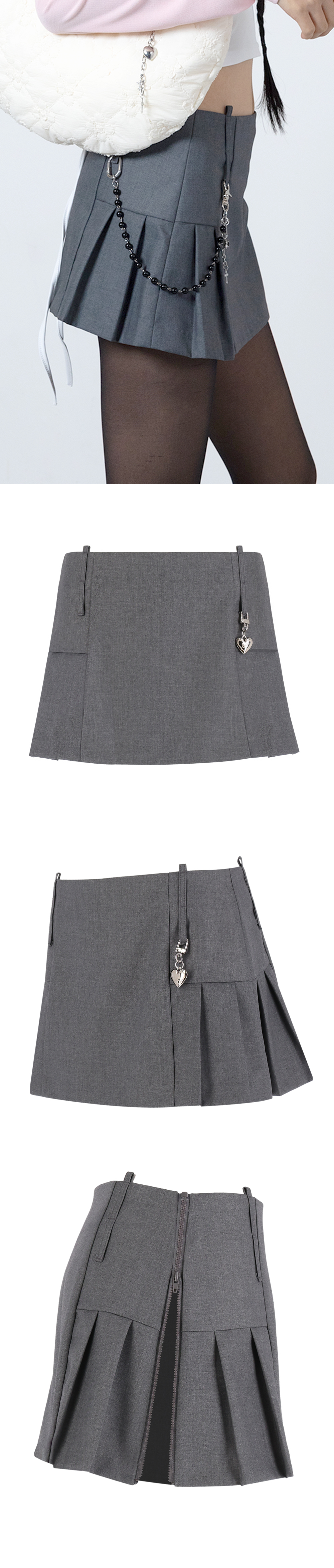 - 마이크로 미니 플리츠 스커트입니다. - 옆판에 전체 오픈 지퍼를 사용하여, 팬츠위에 레이어드하기 좋도록 디자인하였습니다. - 허리벨트를 길게 제작한 후 바텍으로 나누어, 다양한 키링, 벨트들을 매치하여 스타일링 가능합니다. - 플리츠제품이지만, 힙 중앙과 앞판은 플랫하게 디자인하여, 핏되는 무드로 연출가능합니다. - 지퍼 아래를 약간 오픈하여 착용시 슬릿처럼 착용가능합니다. - 공단끈이 포함된 제품으로, 다양한 스타일링에 활용하기 좋습니다. - (상세페이지내 키링은 연출된 이미지로 포함되지 않습니다.)