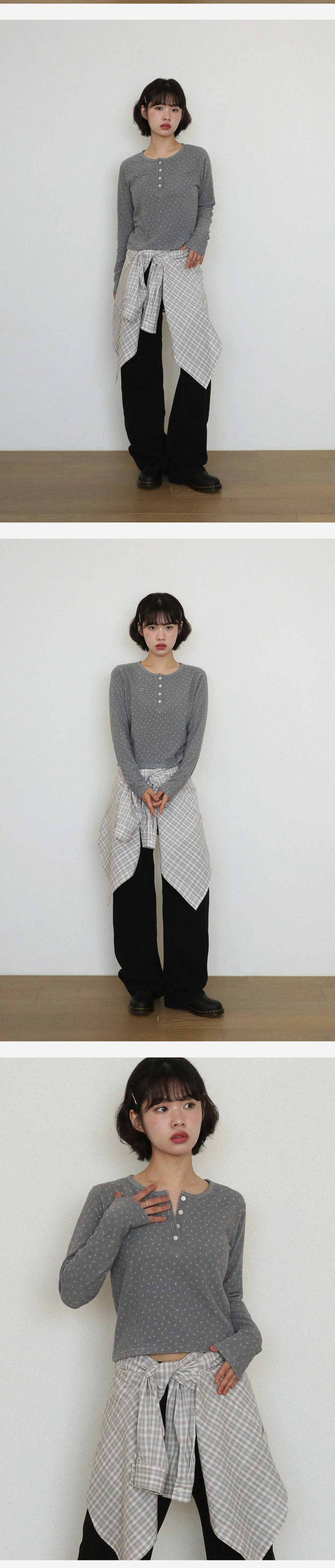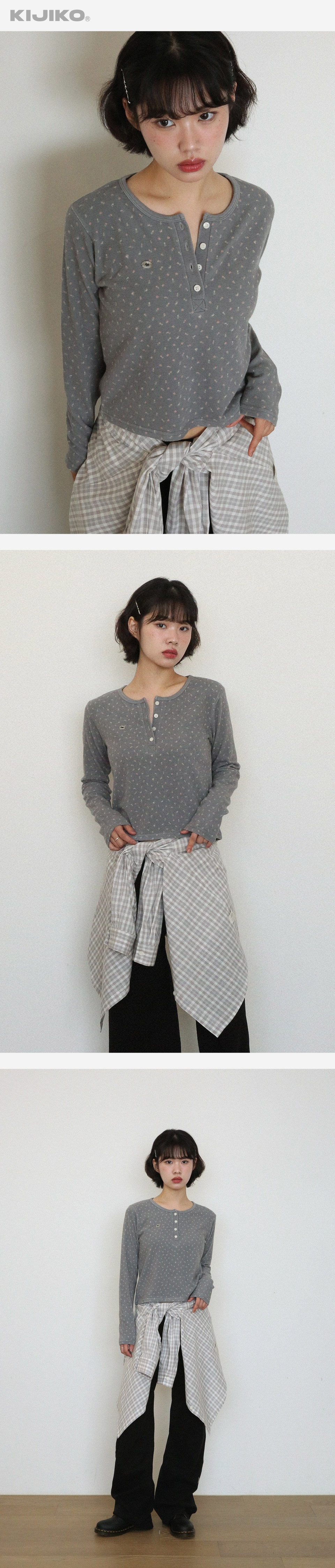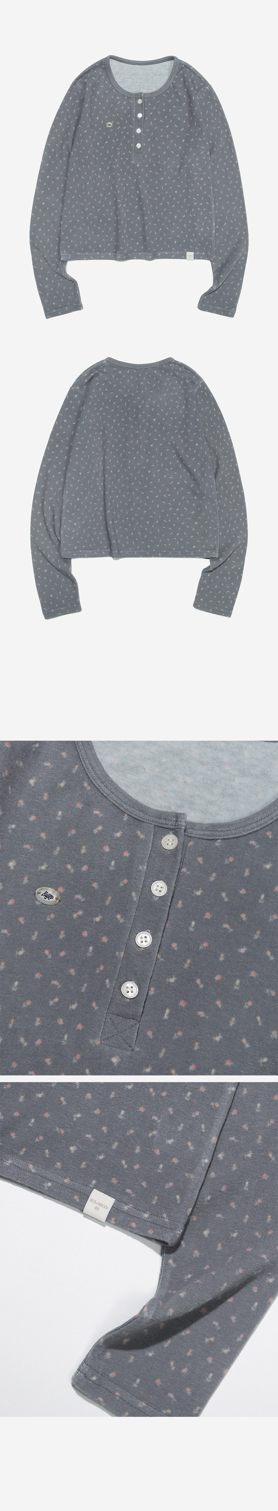 KIJIKO® DESCRIPTION • 귀여운 패턴을 지닌 헨리넥 긴팔티 - 은은하게 입힌 꽃패턴 원단사용 - 헨릭넥 스타일로 넓은 넥라인 - 가슴에 키지코 오벌 단추 - 밑단 키지코 포인트 라벨 • FABRIC - Acrylic45% Rayon22% Angora3% • SIZE INFORMATION - Model - Height 163 / Wearing OS Size - OS size - 총장/48 - 어깨너비/36 - 가슴단면/45 - 소매길이/59