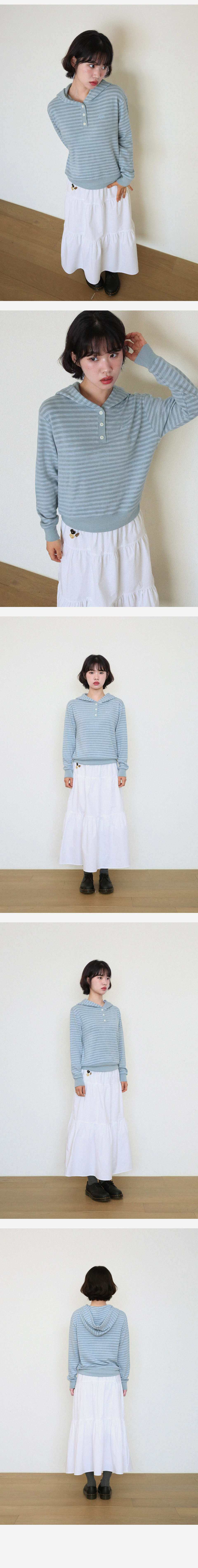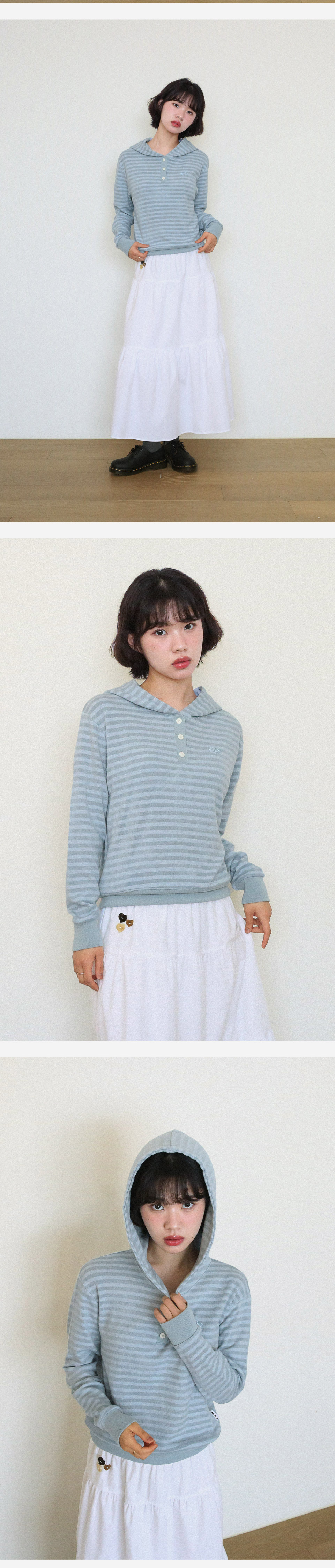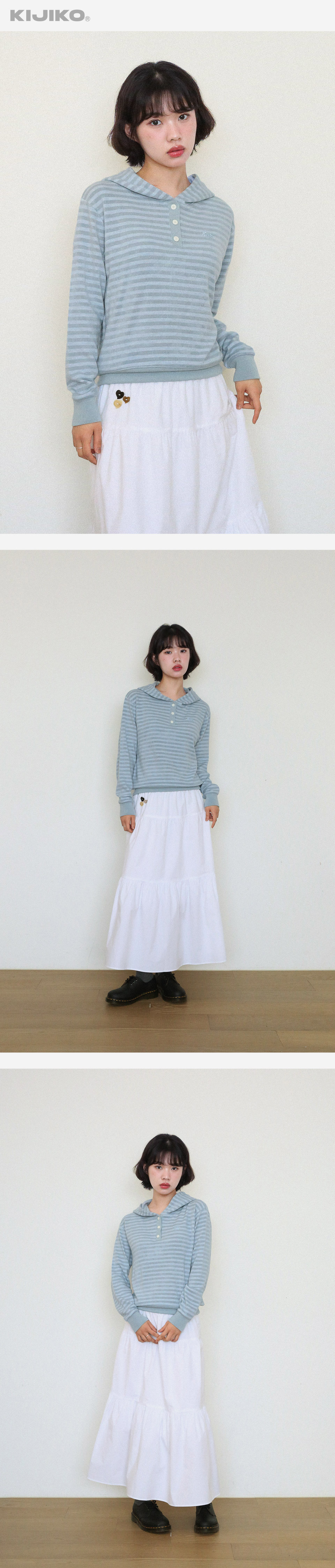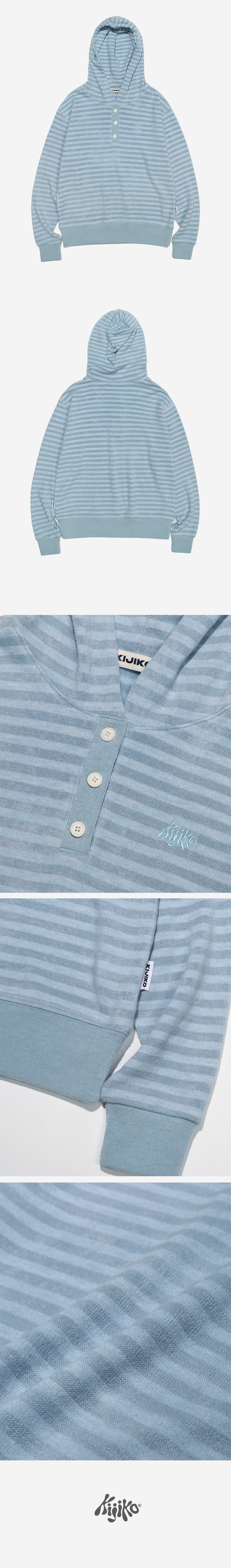 KIJIKO® DESCRIPTION • 포근함을 지닌 스트라이프 후드 니트 - 적당한 굵기의 스트라이프 패턴원단 - 톤인톤 배색으로 자연스러움 연출 - 가슴에 키지코 로고를 자수 표현 - 13mm 단추를 사용하여 클래식 강조 - 허리 키지코 라벨 • FABRIC - Acrylic50% Poly35% Rayon10% Span5% • SIZE INFORMATION - Model - Height 163 / Wearing OS Size - OS size - 총장/56 - 어깨너비/45 - 가슴단면/47 - 소매길이/55
