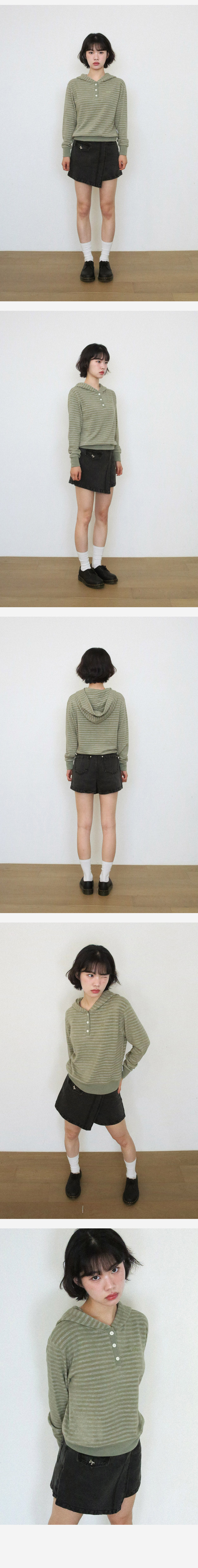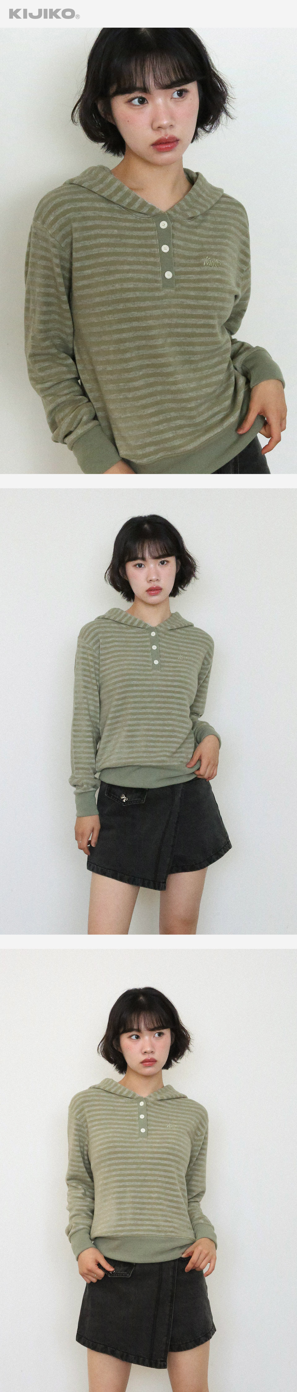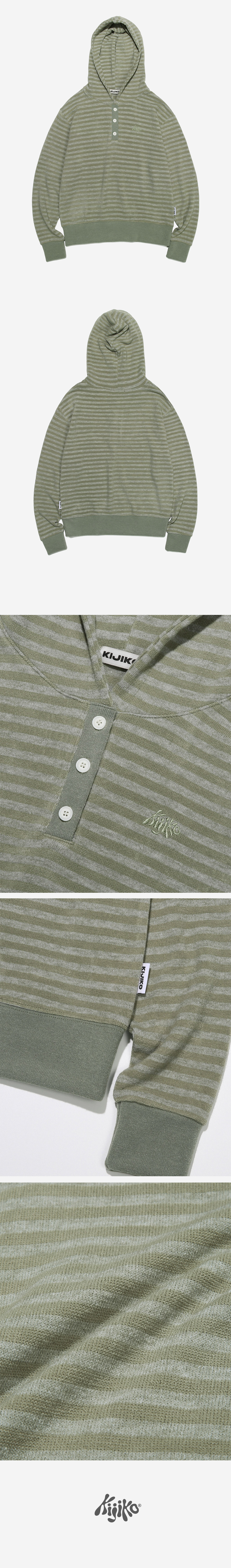 KIJIKO® DESCRIPTION • 포근함을 지닌 스트라이프 후드 니트 - 적당한 굵기의 스트라이프 패턴원단 - 톤인톤 배색으로 자연스러움 연출 - 가슴에 키지코 로고를 자수 표현 - 13mm 단추를 사용하여 클래식 강조 - 허리 키지코 라벨 • FABRIC - Acrylic50% Poly35% Rayon10% Span5% • SIZE INFORMATION - Model - Height 163 / Wearing OS Size - OS size - 총장/56 - 어깨너비/45 - 가슴단면/47 - 소매길이/55