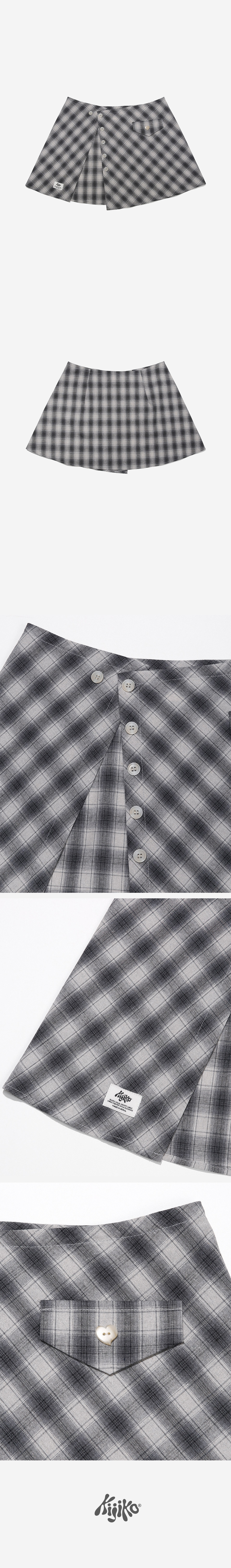 KIJIKO® DESCRIPTION • 언발란스 포켓 체크 랩 스커트 - 그라데이션 느낌을 주는 옴브레체크 원단 - 페이크포켓의 하트버튼 포인트 - 언발라스 패턴 - 클래식한 느낌을 주기위해 15mm버튼 사용 - 허리 버튼으로 사이즈 조절가능 • FABRIC - Cotton 100% • SIZE INFORMATION - Model - Height 163 / Wearing OS Size - OS size / 사이즈 조절가능 - 총장/39 - 허리단면/36~38 - 엉덩이단면/49 - 밑단단면/62