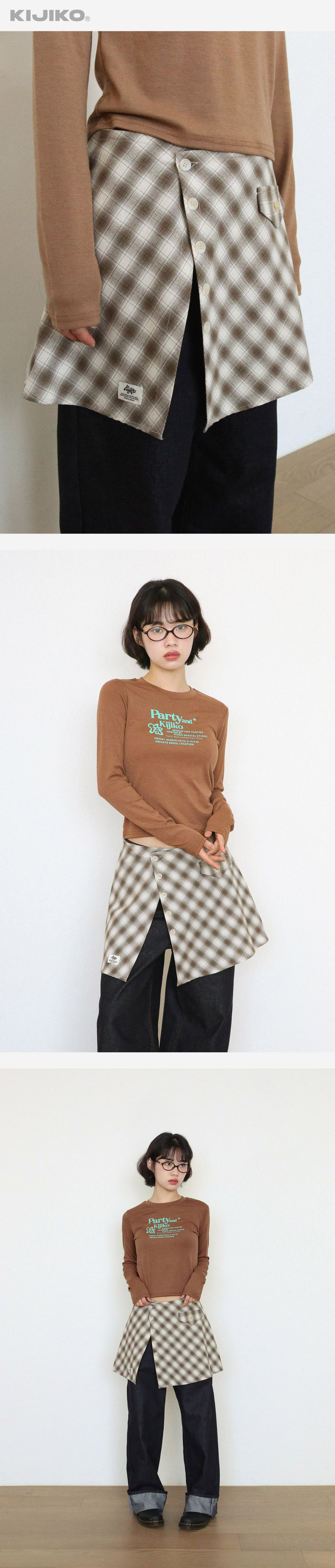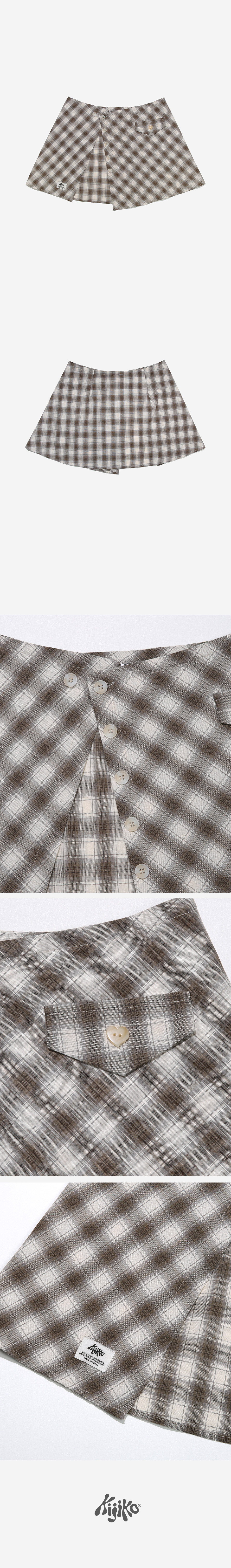KIJIKO® DESCRIPTION • 언발란스 포켓 체크 랩 스커트 - 그라데이션 느낌을 주는 옴브레체크 원단 - 페이크포켓의 하트버튼 포인트 - 언발라스 패턴 - 클래식한 느낌을 주기위해 15mm버튼 사용 - 허리 버튼으로 사이즈 조절가능 • FABRIC - Cotton 100% • SIZE INFORMATION - Model - Height 163 / Wearing OS Size - OS size / 사이즈 조절가능 - 총장/39 - 허리단면/36~38 - 엉덩이단면/49 - 밑단단면/62