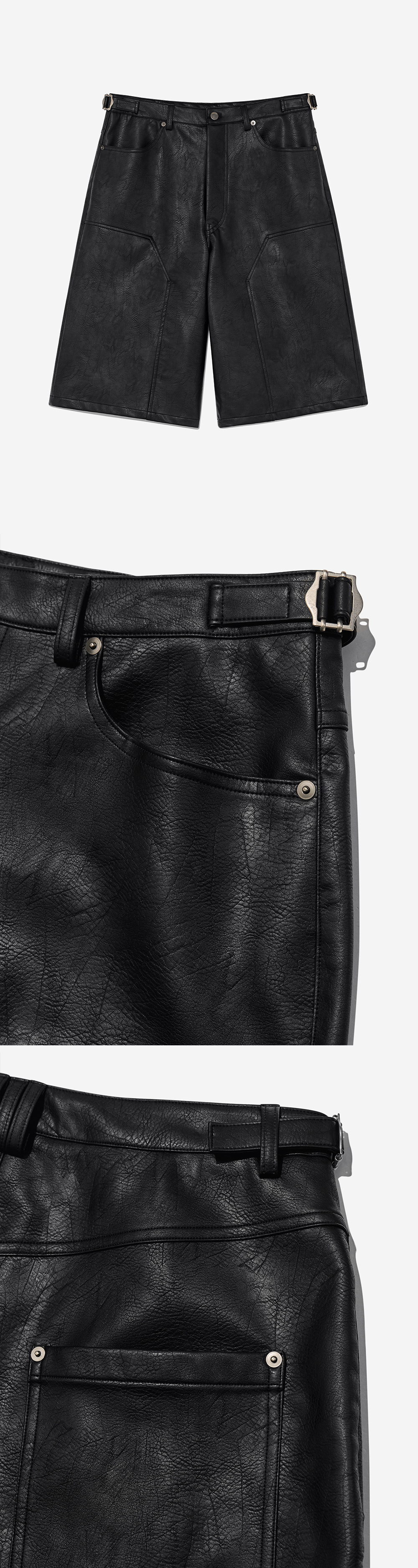 카펜터 팬츠를 미니멀하게 풀어낸 버뮤다 쇼츠입니다. 은은한 광택감과 자연스러운 질감이 매력적인 비건 레더를 사용하여 캐주얼하면서도 고급스러운 무드를 연출합니다. 와이드 한 실루엣으로 편하면서 세련되게 스타일링하기 좋은 제품입니다. -model- men model : 183.5cm / 가슴둘레 86cm / 허리둘레 71cm / 엉덩이둘레 91cm - 2사이즈 착용