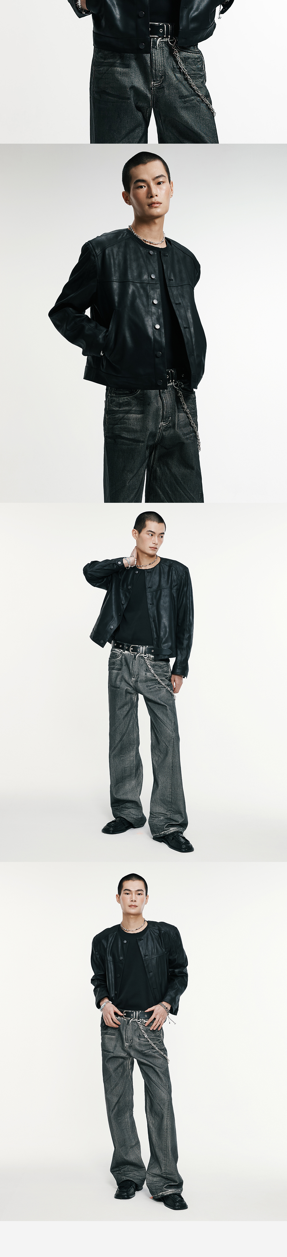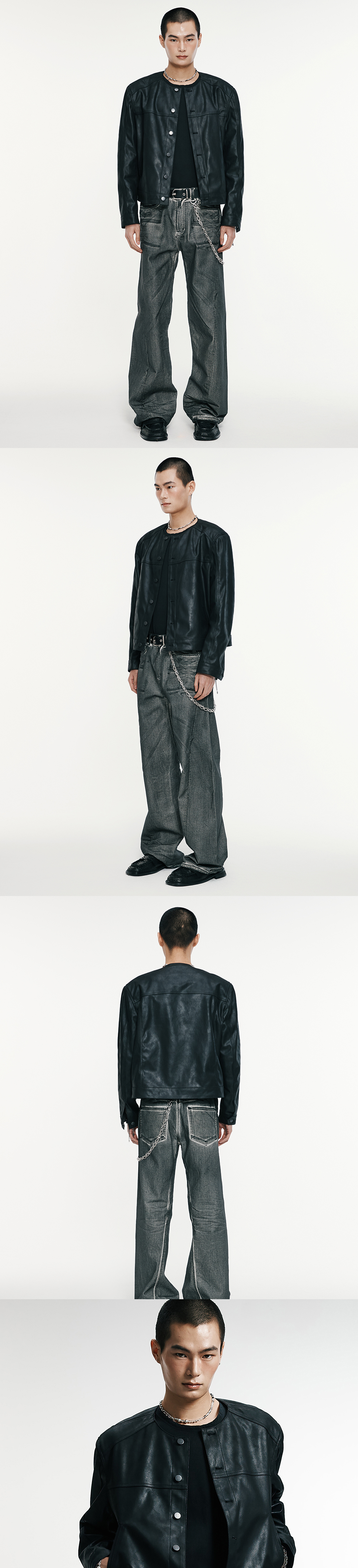 직선적인 날렵한 실루엣이 매력적인 카라리스 자켓입니다 . 크랙 가공 워싱 처리된 인조 스웨이드 소재로 그런지하면서 힙한 무드를 보여줍니다. 입체적인 절개라인과 어깨 패드 작업을 통한 탄탄하면서도 세련된 실루엣으로 캐주얼하면서도 트렌디하게 연출하기 좋은 제품입니다. -model- 184cm / 가슴둘레 83cm / 허리둘레 70cm / 엉덩이둘레 90cm - 2사이즈 착용