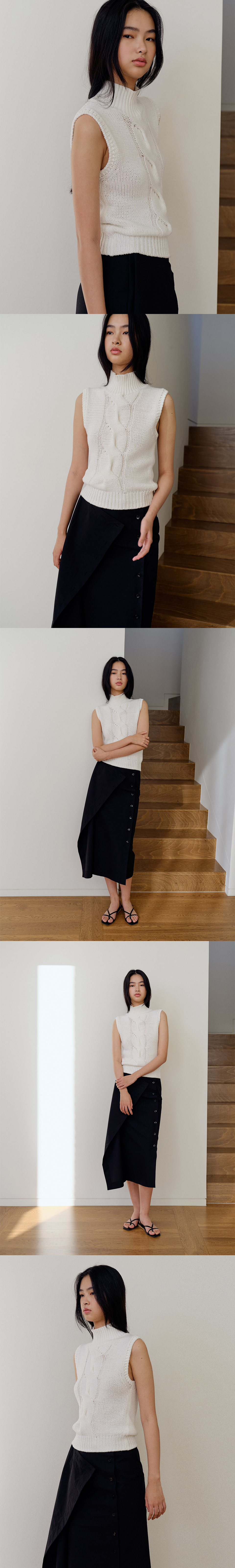 폴라 네크 코튼 혼방 슬리브리스 니트 탑. 볼드한 트위스트 조직, 슬림핏, 코튼 혼방의 쾌적한 터치, 네크 /밑단 립 조직으로 편안한 착용감. COTTON 58 ACRYLIC 42 기계세탁 불가 / 드라이클리닝 권장 / 중온 다림질 (약 180-200℃) 변형을 막기 위해서 드라이클리닝을 권장합니다. 손세탁은 차가운 온도로 단기간에 마무리합니다. ** 사이즈 총장: 58.5 cm 어깨 단면: 37 cm 암홀 단면: 20 cm 바스트 단면: 33.5 cm 밑단 단면: 31.5 cm