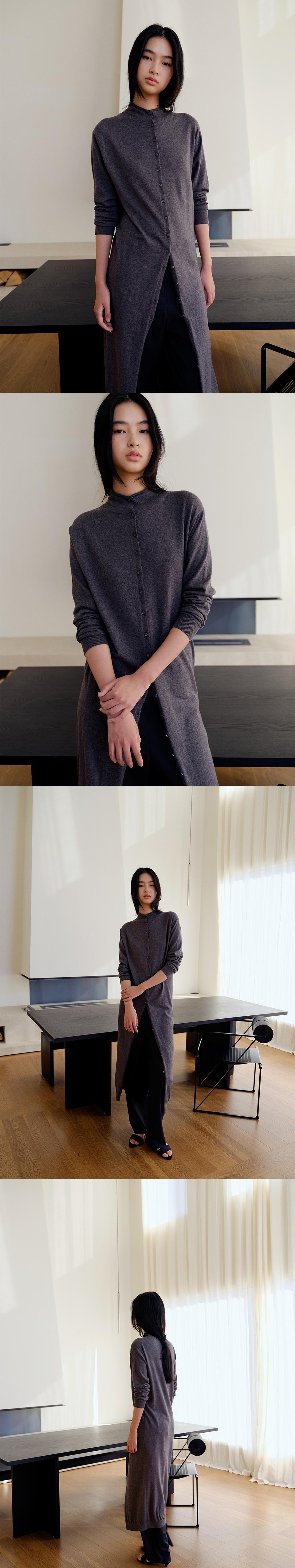 버튼-업 니트 가디건 드레스. 자연스럽게 말리는 디테일의 모크 네크라인, 작은 자개단추의 반복, 데일리한 터치와 섬세한 조직감, 커프스/밑단 립 조직으로 자연스러운 활동성. COTTON 60 VISCOSE 40 기계세탁 불가 / 드라이클리닝 권장 / 중온 다림질 (약 180-200℃) 변형을 막기 위해서 드라이클리닝을 권장합니다. 손세탁은 차가운 온도로 단기간에 마무리합니다. ** 사이즈 총장: 127 cm 어깨 단면: 45 cm 암홀 단면: 23 cm 바스트 단면: 47 cm 밑단 단면: 37 cm 소매 길이: 55 cm 소매 부리 단면: 8 cm