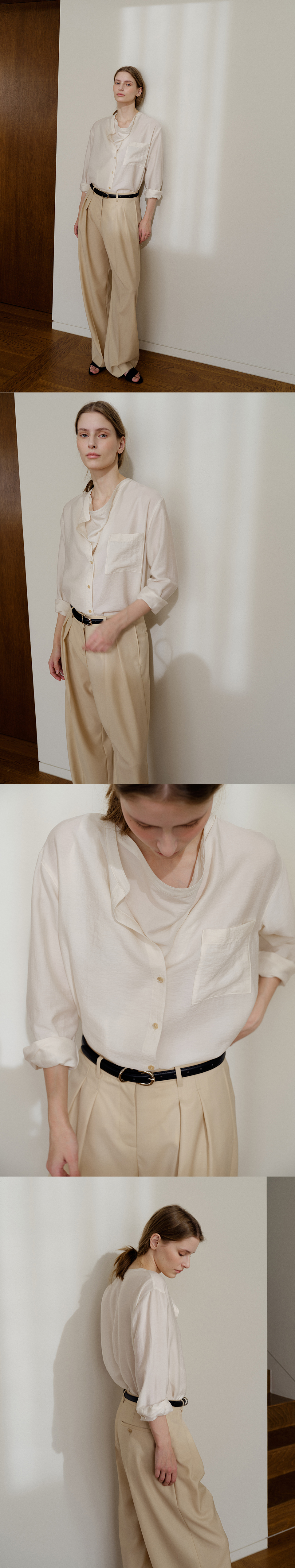 드레이퍼리 네크라인 셔츠. 이너 패널 네크라인에서 만들어지는 드레이퍼리 디테일, 여유로운 실루엣, 자연스럽게 흐르는 소재감, 자개 버튼. TENCEL 73 NYLON 14 WOOL 13 기계세탁 불가 / 드라이클리닝 권장 / 중온 다림질 (약 180-200℃) 변형을 막기 위해서 드라이클리닝을 권장합니다. 손세탁은 차가운 온도로 단기간에 마무리합니다. ** 사이즈 총장: 75 cm 어깨 단면: 48 cm 암홀 단면: 18 cm 바스트 단면: 54 cm 밑단 단면: 57.5 cm 소매 길이: 58 cm 소매 부리 단면: 9 cm