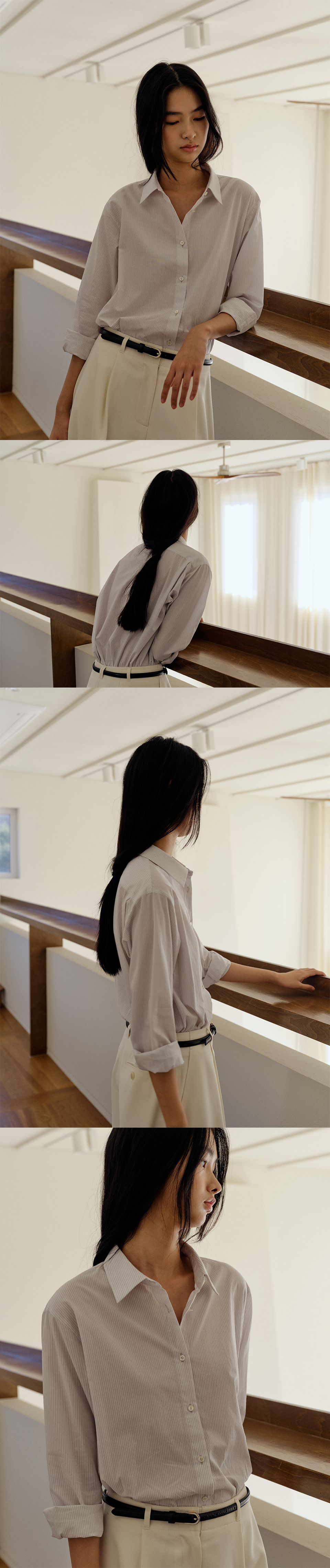 레귤러 핏의 버튼업 코튼 셔츠. (KAGEYAMA JAPAN FABRIC) 레귤러 핏, 자개 버튼 디테일의 플래킷 및 커프스. 차분한 대비감의 경사 방향 그레이 스트라이프. Fabric Description : Made with fine-count organic cotton 고급 유기농 코튼으로 제작된 원단입니다. COTTON 100부드럽게 기계 세탁 가능 / 자연건조 / 중온 다림질 (약 180-200℃) *잦은 기계세탁과 건조기 사용 시 옷이 수축될 수 있습니다. 드라이클리닝과 손세탁을 권장합니다. ** 사이즈 총장: 68 cm 어깨 단면: 45 cm 암홀 단면: 19 cm 바스트 단면: 53 cm 밑단 단면: 56 cm 소매 길이: 54 cm 소매 부리 단면: 10.5 cm