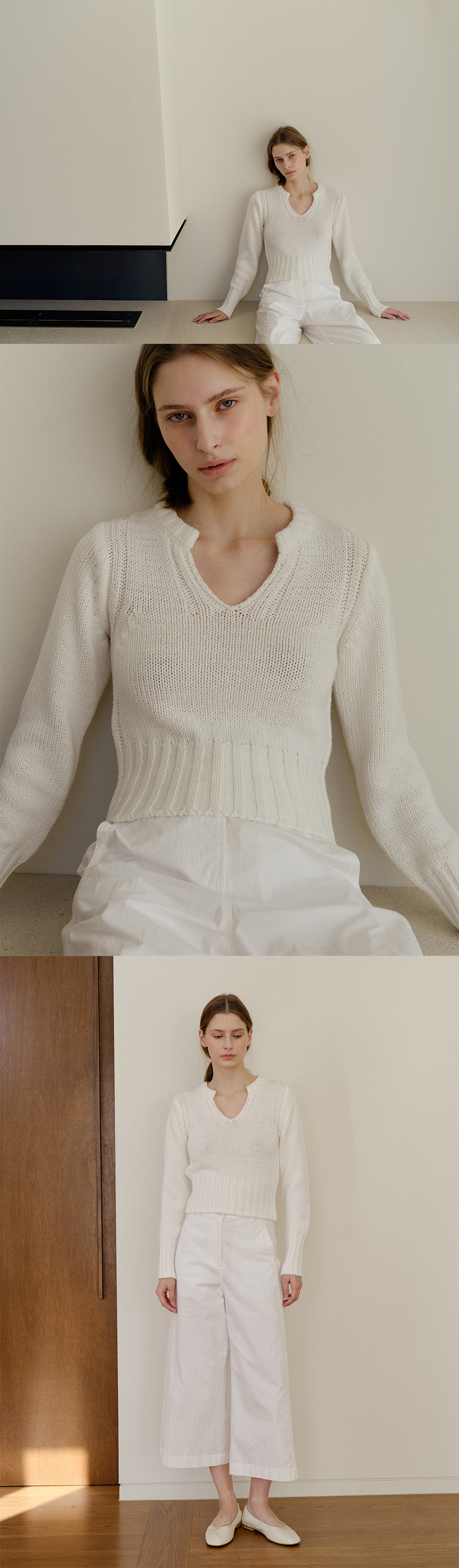 코튼 혼방 브이 네크 니트 풀오버. 라운드 쉐잎의 립 조직과 브이 쉐잎의 슬릿이 교차하는 센슈얼한 네크라인, 슬림핏, 코튼 혼방의 쾌적한 터치, 볼드한 네크/ 커프스/ 밑단 립 조직으로 편안한 착용감. COTTON 58 ACRYLIC 42 기계세탁 불가 / 드라이클리닝 권장 / 중온 다림질 (약 180-200℃) 변형을 막기 위해서 드라이클리닝을 권장합니다. 손세탁은 차가운 온도로 단기간에 마무리합니다. ** 사이즈 총장: 47 cm 어깨 단면: 36 cm 암홀 단면: 20 cm 바스트 단면: 38 cm 밑단 단면: 26 cm 소매 길이: 60 cm 소매 부리 단면: 8 cm