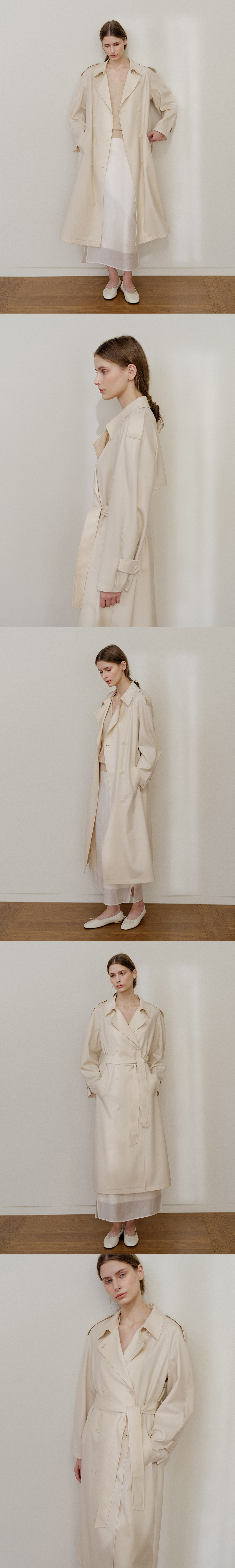 울 개버딘 트렌치 코트. 탄성있게 흐르는 우아한 소재감, 소매와 어깨, 웨이스트 벨티드 마감, 앞면 웰트 포켓, 천연 소뿔 단추, 오버사이즈 클래식 테일러드 트렌치코트. WOOL 60 POLYESTER 40 기계세탁 불가 / 드라이클리닝 권장 / 중온 다림질 (약 180-200℃) 변형을 막기 위해서 드라이클리닝을 권장합니다. 손세탁은 차가운 온도로 단기간에 마무리합니다. ** 사이즈 총장: 117 cm 암홀 단면: 34 cm 바스트 단면: 58 cm 밑단 단면: 66.5 cm 화장: 85 cm 소매 부리 단면: 18 cm