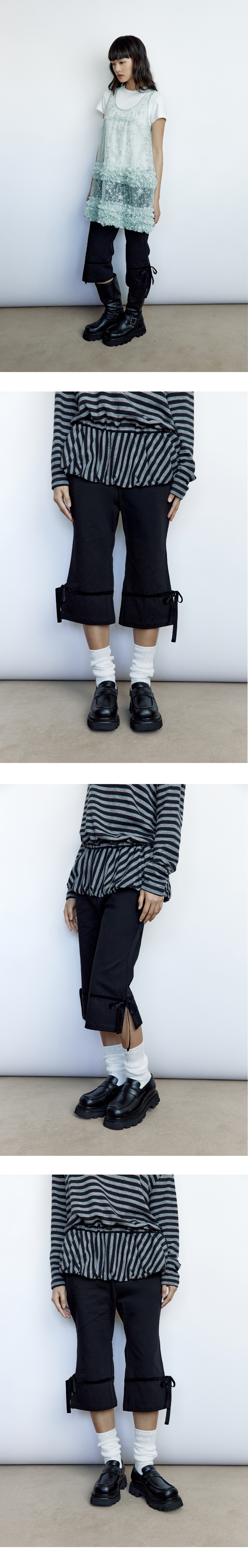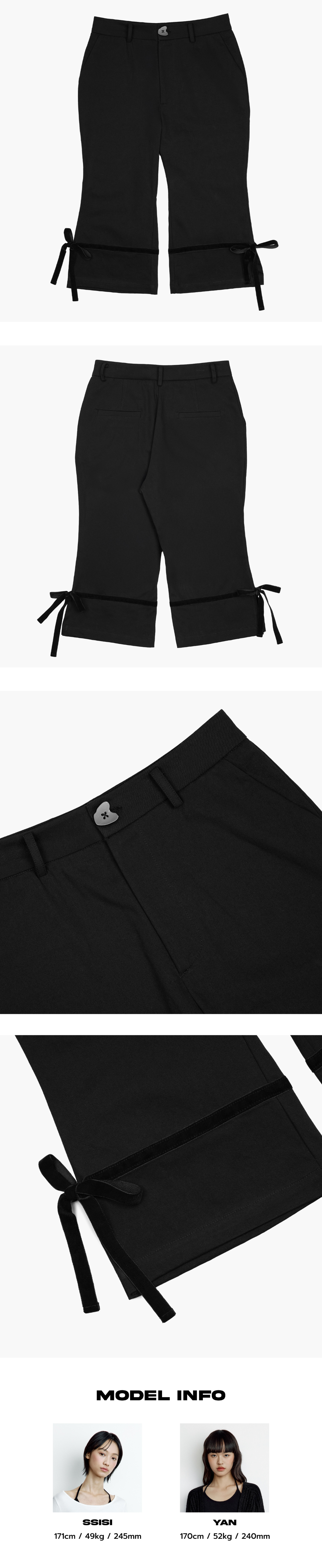 6부 기장의 부츠컷 팬츠입니다. 독특한 단추와 밑단에 벨벳 리본을 달아 디테일을 더했습니다. 밑단의 절개 디테일은 스타일은 물론 활동성을 더욱 높여주며, 편안한 착용감으로 부담 없이 스타일을 즐길 수 있는 아이템입니다. - Cotton 100% - Model Info : YAN (170cm / 52kg) / SSISI (171cm / 49kg) - Fitting size : S
