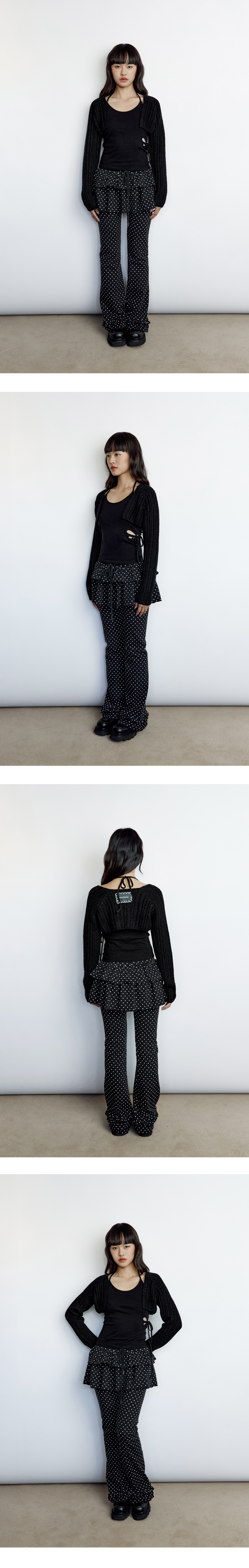 부드러운 니트 소재로 제작된 팬츠로 허리와 밑단의 프릴 디테일은 사랑스러운 느낌을 주며, 부츠컷 디자인으로 다리 라인이 길고 슬림하게 연출됩니다. 원단의 신축성과 허리 밴딩 제품으로 활동성과 편안한 착용감을 제공합니다. - Cotton 80% Polyester 15% Span 5% - Model Info : YAN (170cm / 52kg) / SSISI (171cm / 49kg) - Fitting size : S