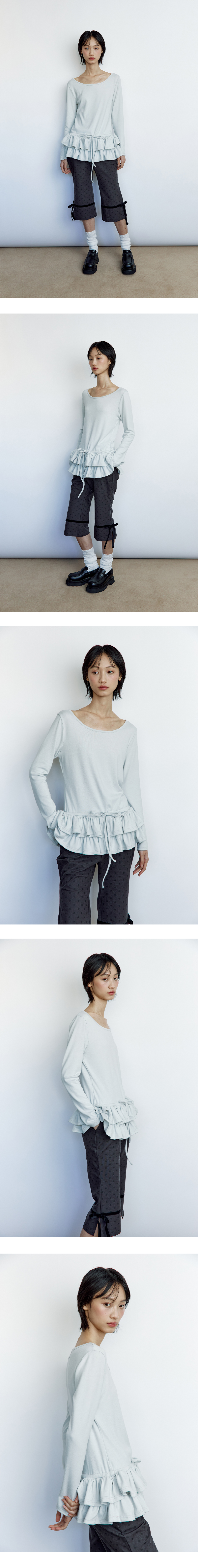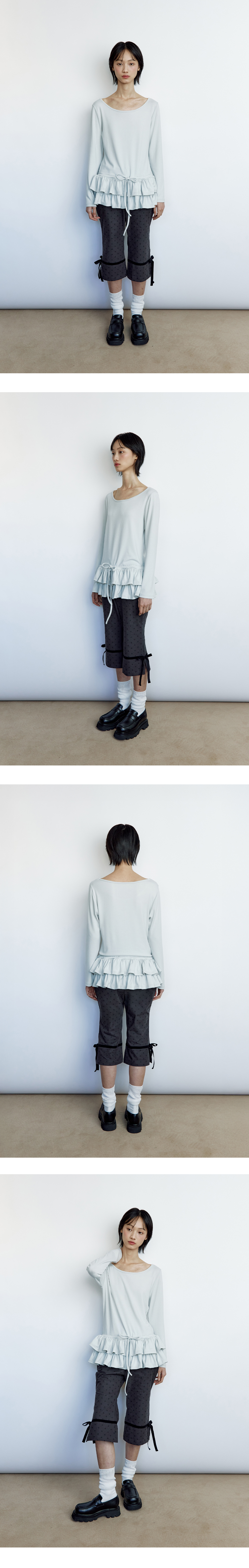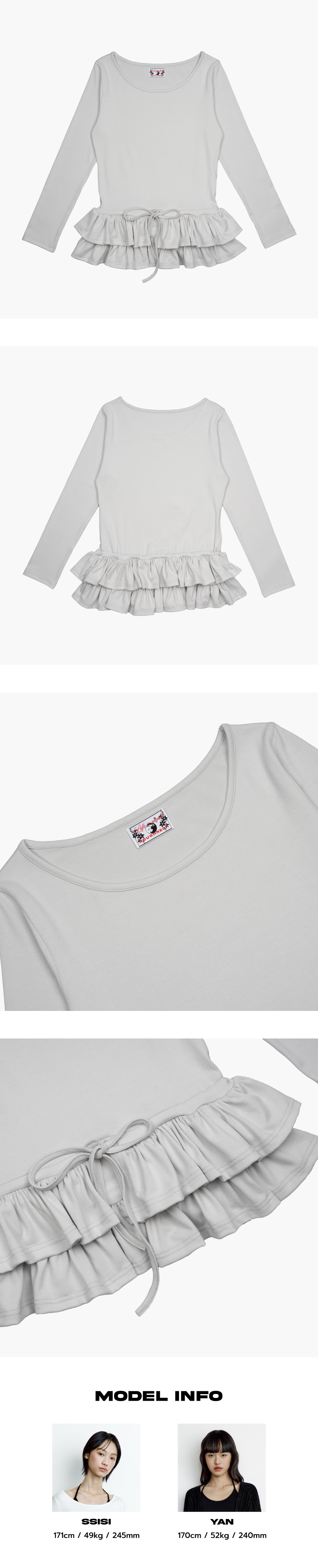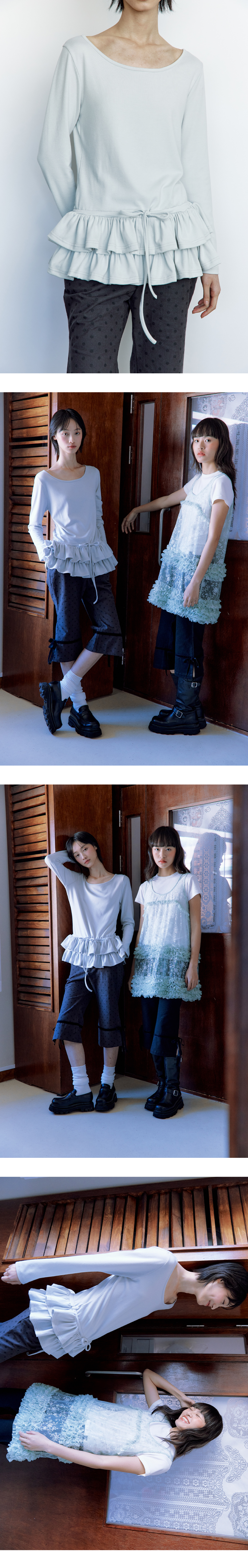 촉촉하고 부드러운 소재로 제작된 티셔츠입니다. 밑단의 2겹 러플 디테일과 허리쪽의 끈으로 원하는 실루엣으로 연출이 가능합니다. 여유로운 핏으로 체형에 구애 없이 편안하게 착용 가능한 제품입니다. - Polyester 62% Rayon 34% Span 4% - Model Info : SSISI (171cm / 49kg) / YAN (170cm / 52kg) - Fitting size : FREE