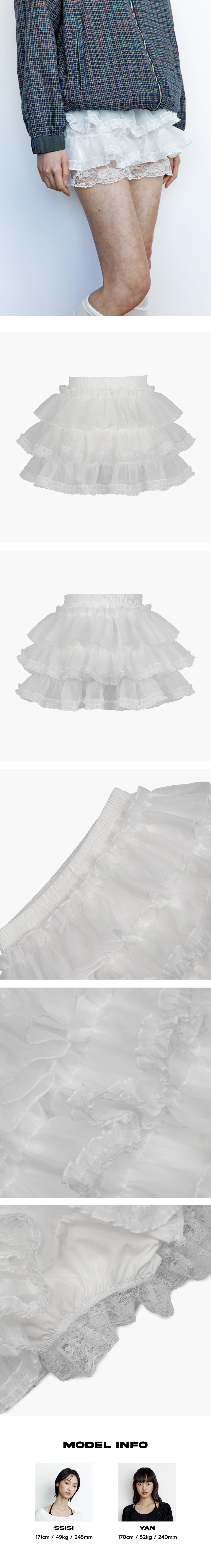 가볍고 포슬거리는 소재를 겹겹히 쌓아 올려 더 풍성하고 귀여운 실루엣을 연출했습니다. 셔링 디테일이 돋보이는 봉재법을 사용하였습니다. 치마 바지 형식으로 안에 바지가 있기때문에 착용감이 무척 편합니다. 허리와 바지 밑단은 신축성 좋은 밴딩으로 되어있어 사이즈의 유동성은 물론 어떤 체형이 입어도 귀여운 코디를 완성할 수 있습니다. 신축성이 매우 좋아 최대 77사이즈까지 무난하게 착용이 가능합니다. - Material : Polyester 100% - Model Info : YAN (170cm / 52kg) / SSISI (171cm / 49kg) - 착용사이즈 : Free size