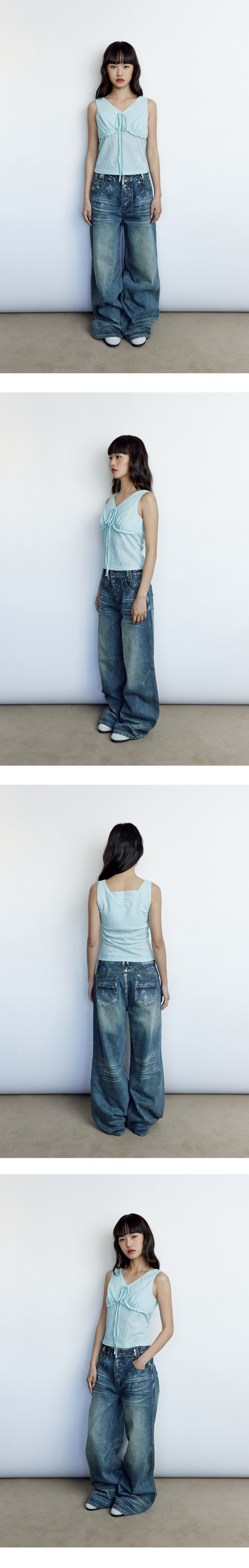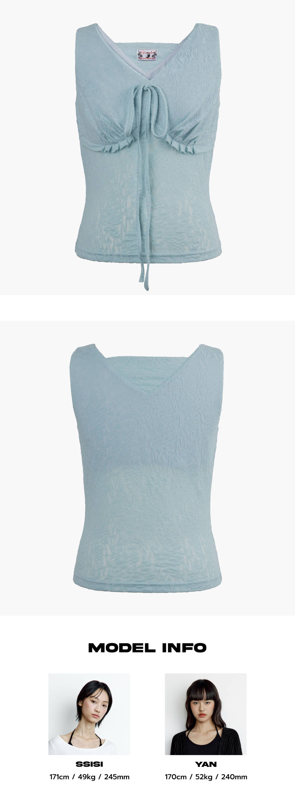 신축성이 좋은 원단을 사용해 착용이 편합니다. 가슴 부분에는 안감을 덧대어 비침이 없고, 자연스럽게 부유방을 커버해 주는 디자인으로 안정적인 핏을 연출해 줍니다. 가슴 부분의 주름 디테일과 리본이 귀여운 무드를 연출합니다. - Cotton 40% Polyester 20% Viscose 11% Nylon 29% - Model Info : YAN (170cm / 52kg) / SSISI (171cm / 49kg) - Fitting size : S