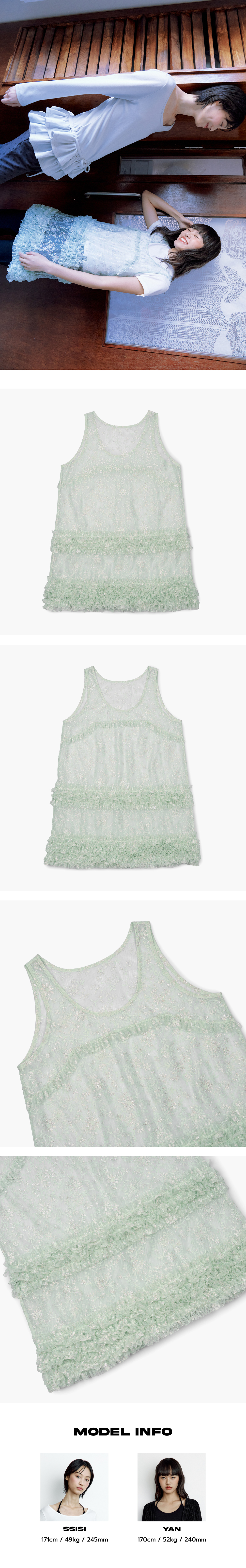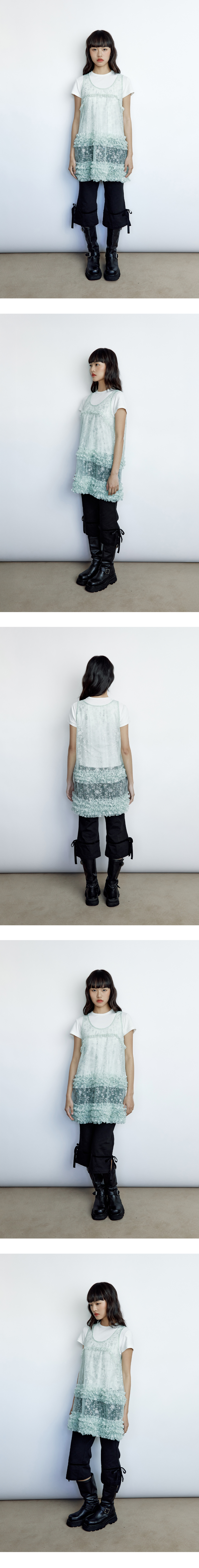 은은한 컬러감에 섬세한 플로럴 은사 디테일이 돋보이는 원피스입니다. 밑단과 중간 부분에 더해진 프릴 장식이 사랑스러운 포인트가 되어 한층 더 특별한 느낌을 줍니다. 루즈핏으로 편안한 착용감을 제공하며, 레이어드 코디에 포인트가 되어줍니다. - Polyester 100% - Model Info : YAN (170cm / 52kg) / SSISI (171cm / 49kg) - Fitting size : FREE
