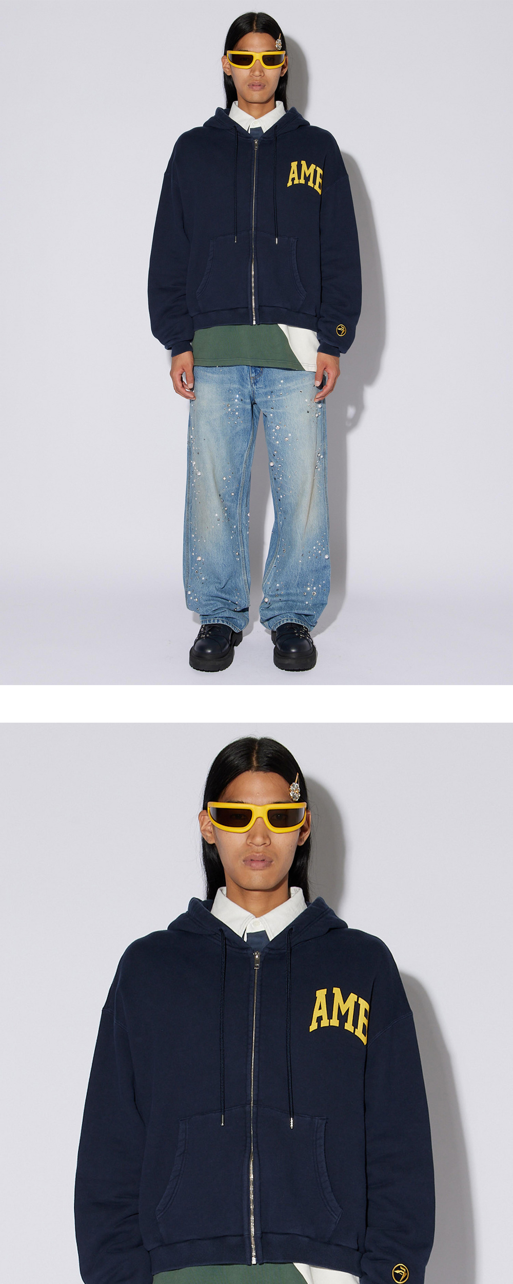 네이비와 옐로우의 조화가 매력적인 앰부쉬의 맨즈 AMB 그래픽 집업 후디 네이비입니다. - 오버핏 - 옐로우 로고 디테일 - 면 100%