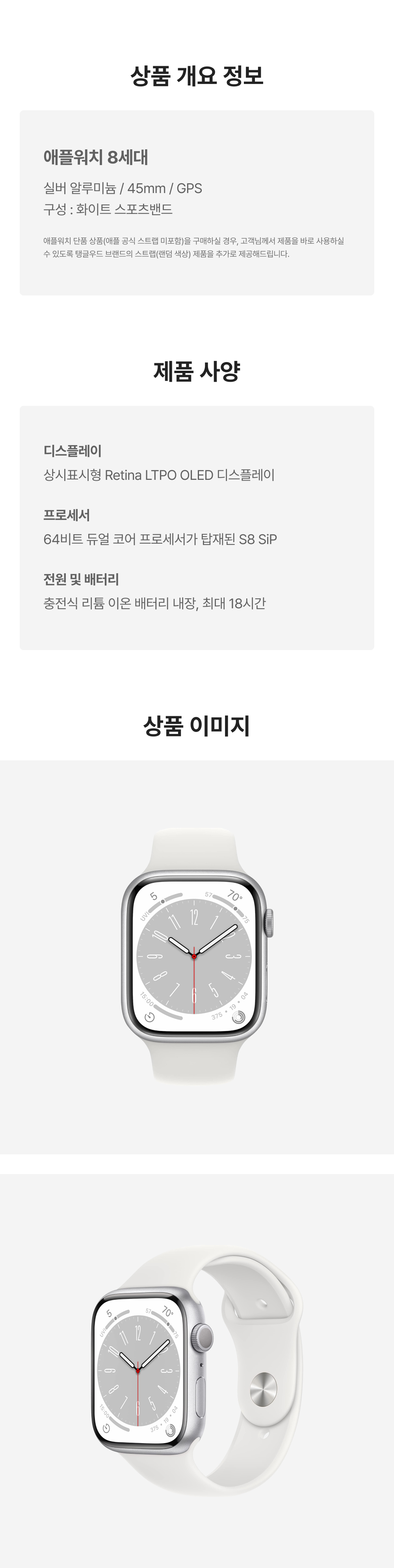 [A등급] 리퍼비시 애플워치 8 45mm GPS 실버 알루미늄 케이스 스포츠 밴드 화이트