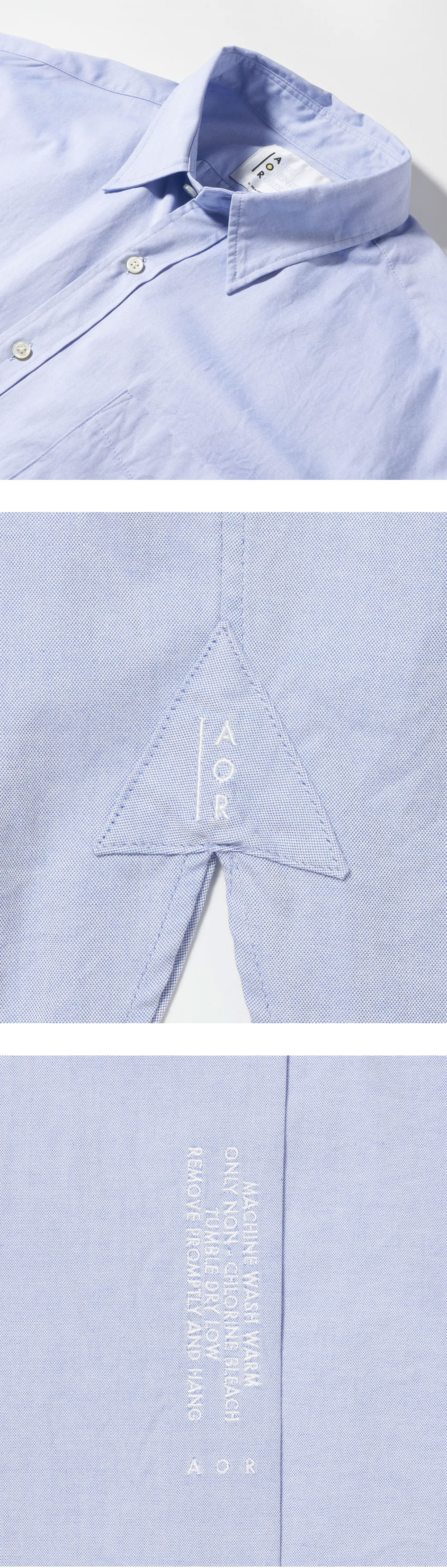 향수를 불러일으키는 AOR의 프란시스 셔츠 삭스 블루입니다. -로버트 케네디를 모티브로 한 AOR의 대표적인 레귤러 칼라 셔츠 -AOR 로고가 포함된 삼각형 패치와 자수 디테일