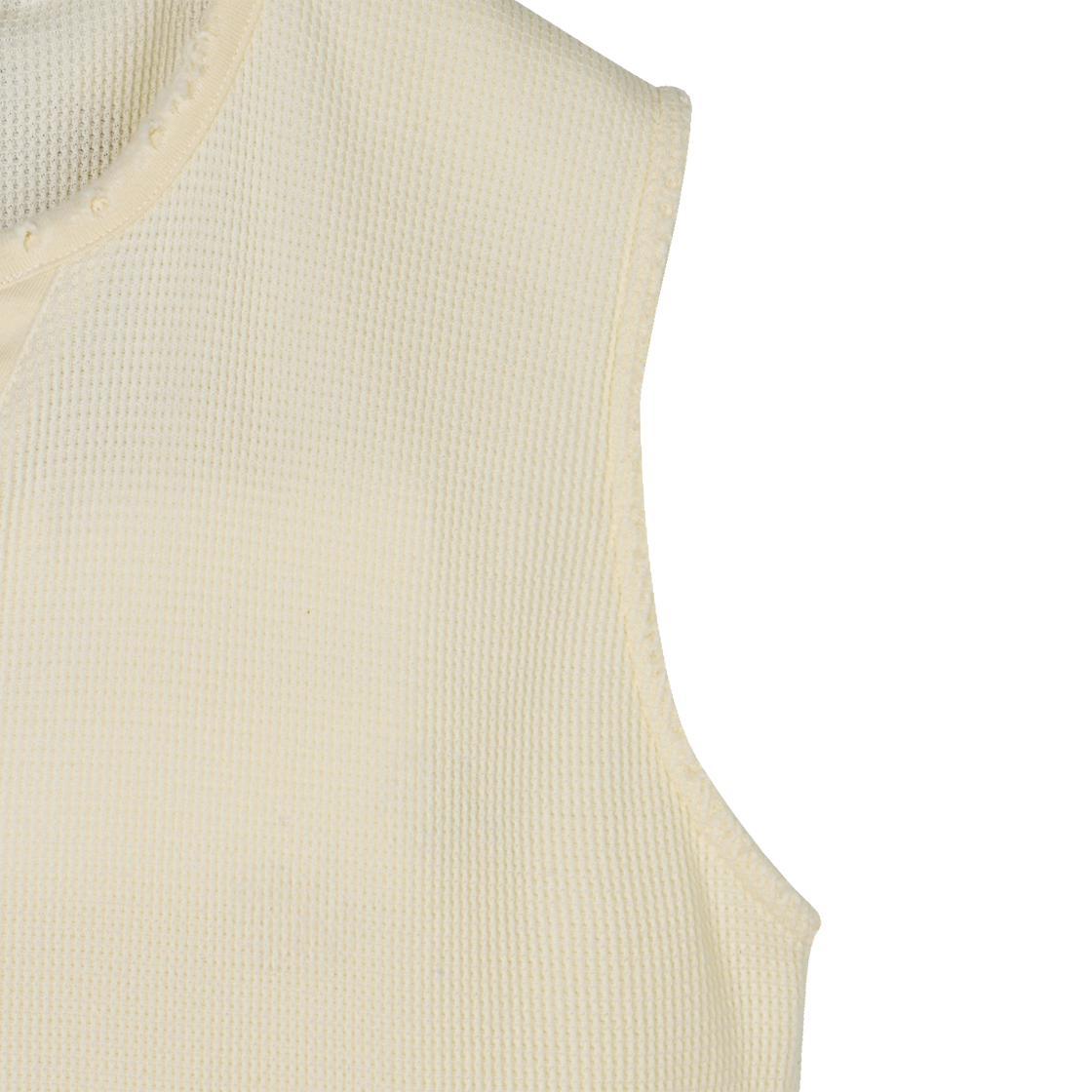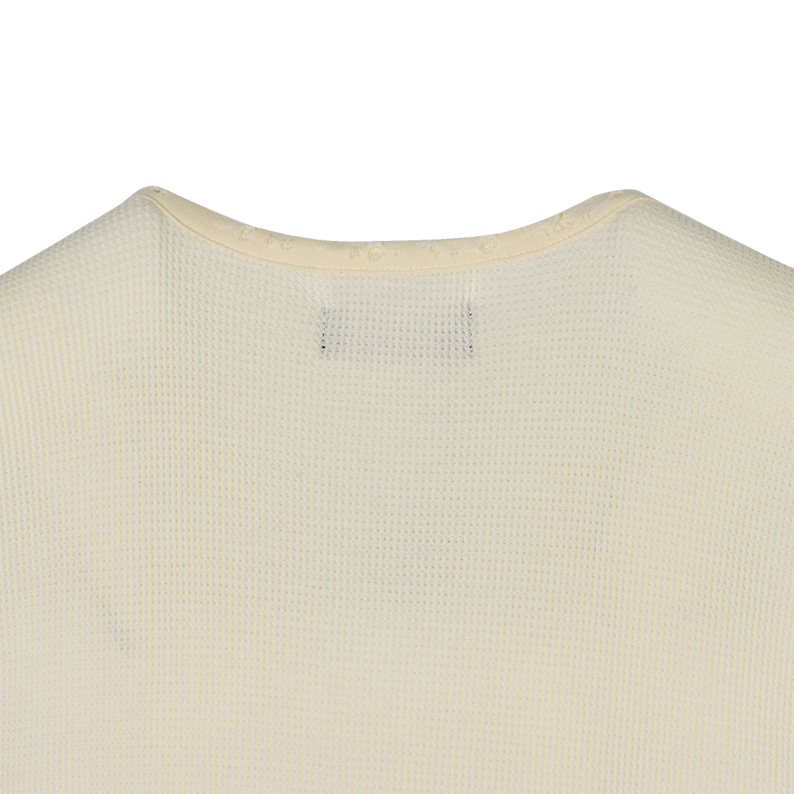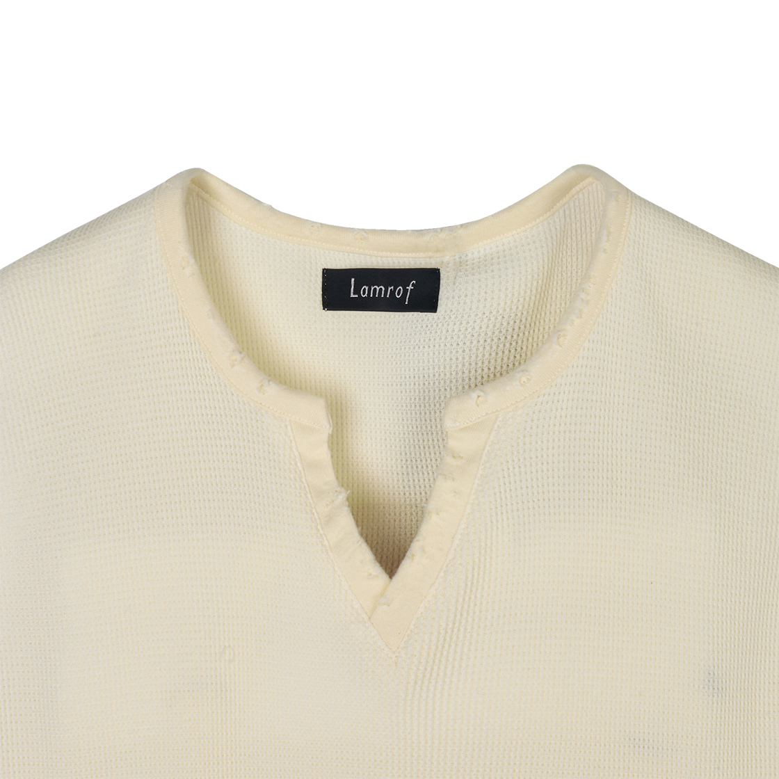 사선 커팅으로 레이어드 하기 유용한 람로프의 보로 슬랜티드 슬리브리스 화이트입니다. - 대담한 밑단 사선 커팅 - V넥 스키퍼 - 옷깃, 밑단, 소매단에 시간이 지남에 따라 변화하는 라이크한 데미지 적용 - 얇은 와플 원단으로 통기성 확보