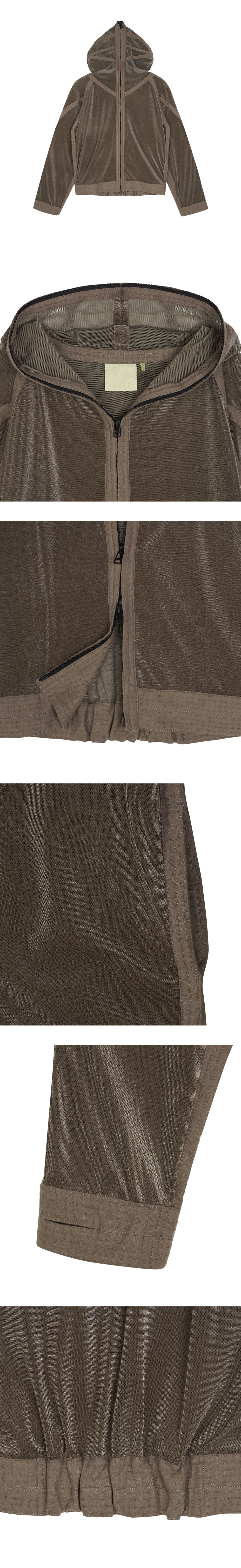 독특한 소재와 브라운 색감의 조화가 매력적인 지안 예의 메쉬 후디 브라운입니다. - 광택감이 있는 메쉬 소재 - 뒷면에 강한 텐션의 셔링 디자인 - 핑거홀 디테일 - 머리 위까지 덮을 수 있는 풀집업