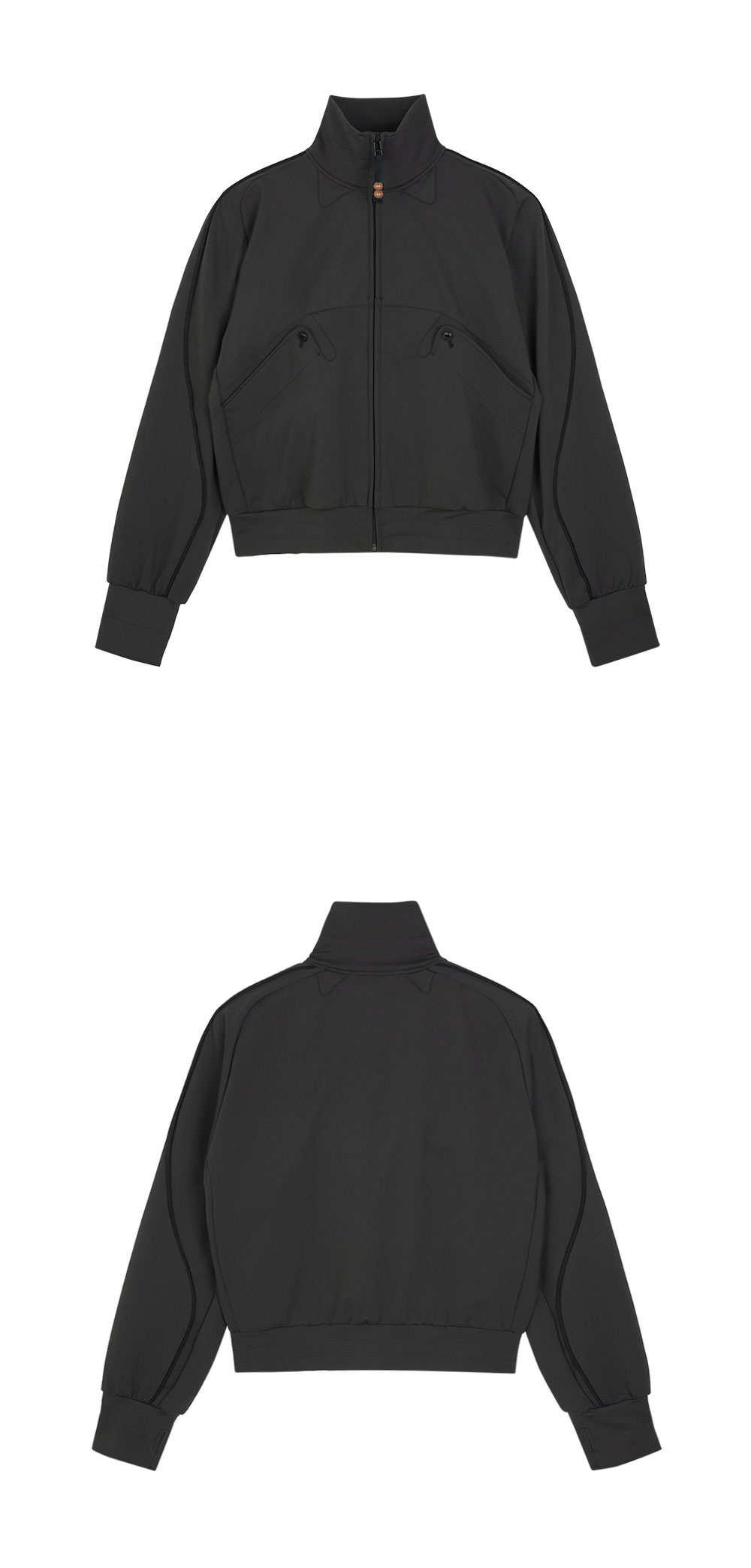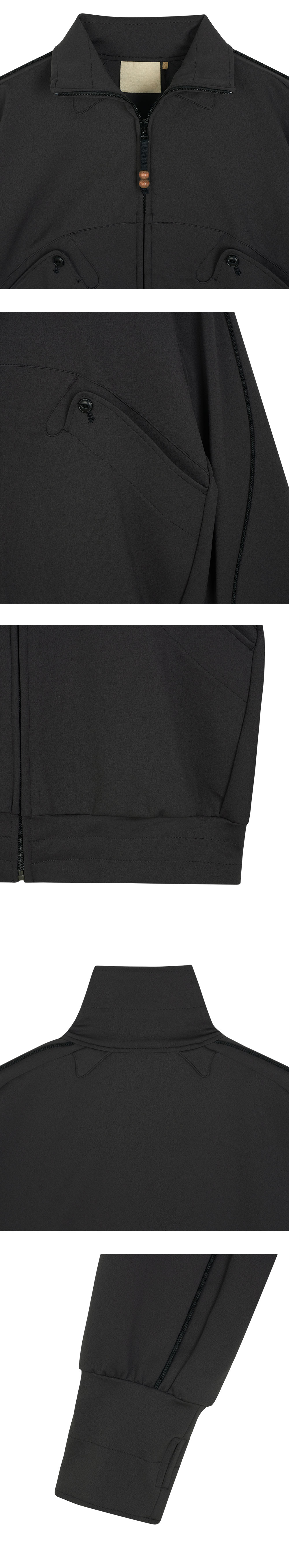 어깨부터 소매에 걸친 파이핑, 목덜미와 포켓의 패널 디자인이 특징인 지안 예의 가우지 자켓 차콜입니다. - 트랙 재킷의 요소를 가진 집업 블루종 - 약간 짧은 길이 - 신축성 있는 나일론 폴리우레탄 소재 - 시그니처인 우드 소재의 구슬 지퍼 패스너 - 소매 끝에 썸홀 배치