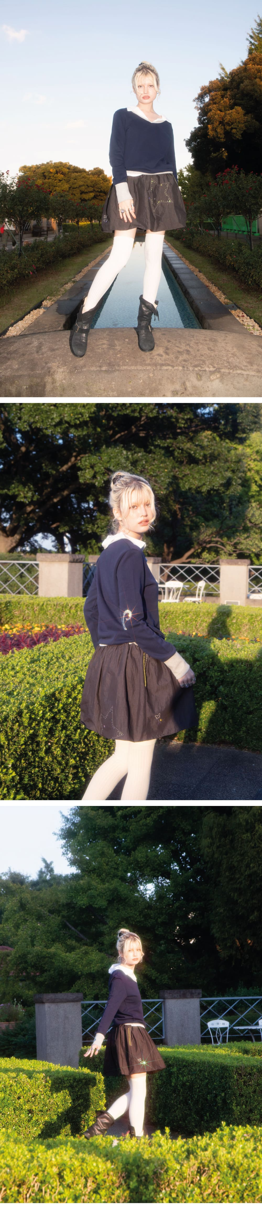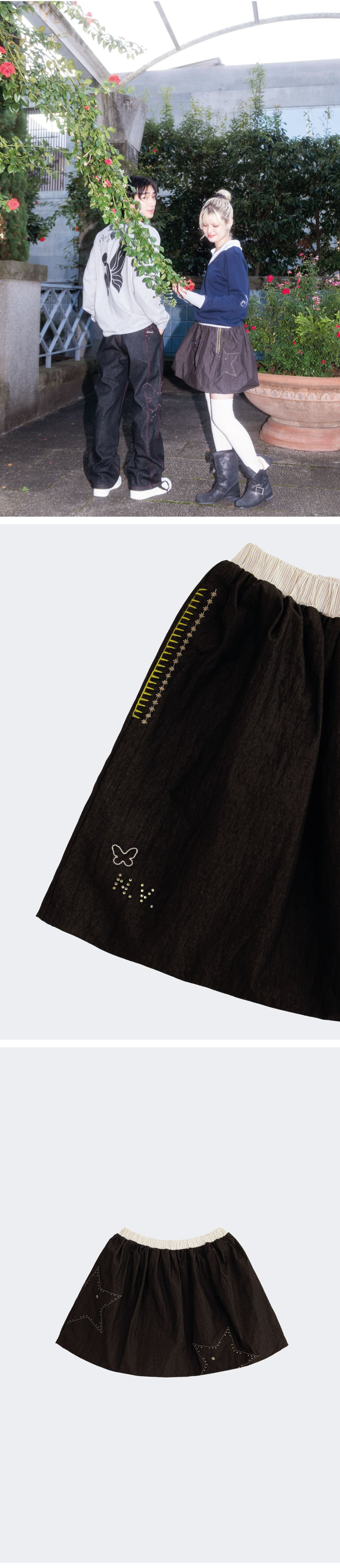 • 별 패치와 스와로브스키 패턴 • 나비버스 로고 스와로브스키 • 스와로브스키 정품 • 나비 핸드 자수 • 허리 밴딩 배색 포인트 • 양 사이드 포켓 핸드 자수 디테일