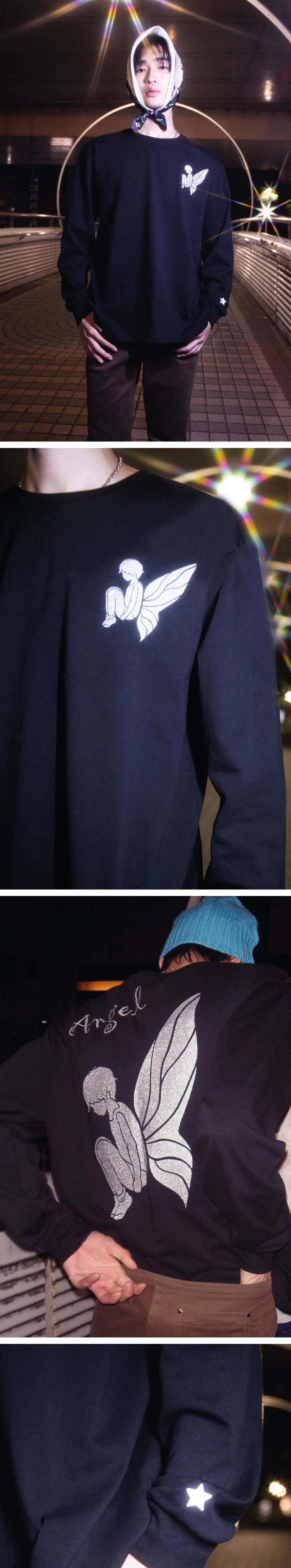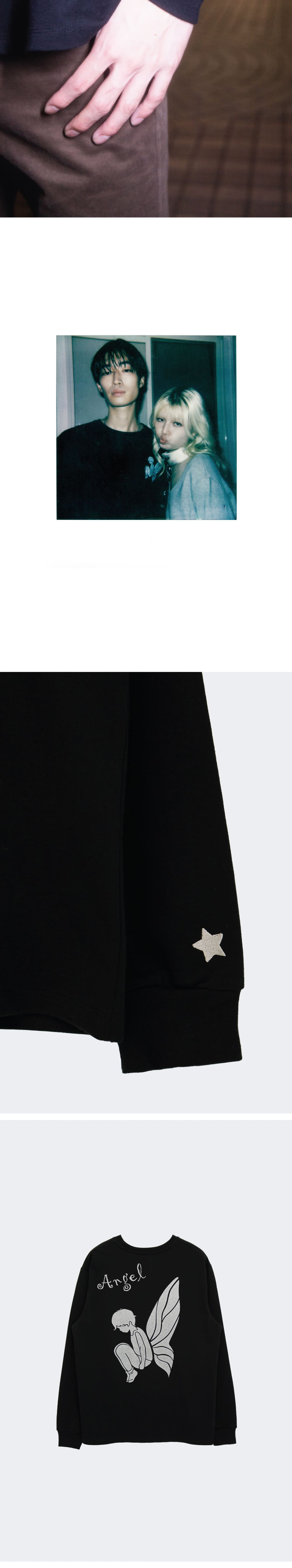 소매 별 자수 디테일 • 제이 천사 그래픽 • 펄 날염 프린트 • 부드러운 코튼 소재 • 여유로운 실루엣 • 모델 착용 사이즈 2