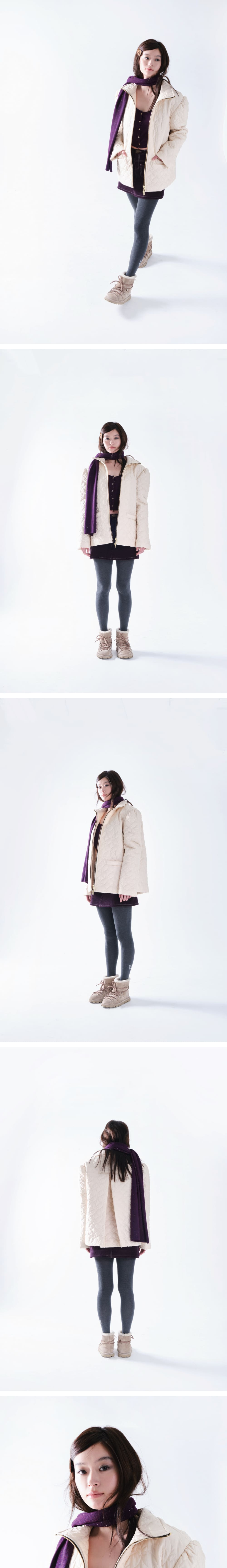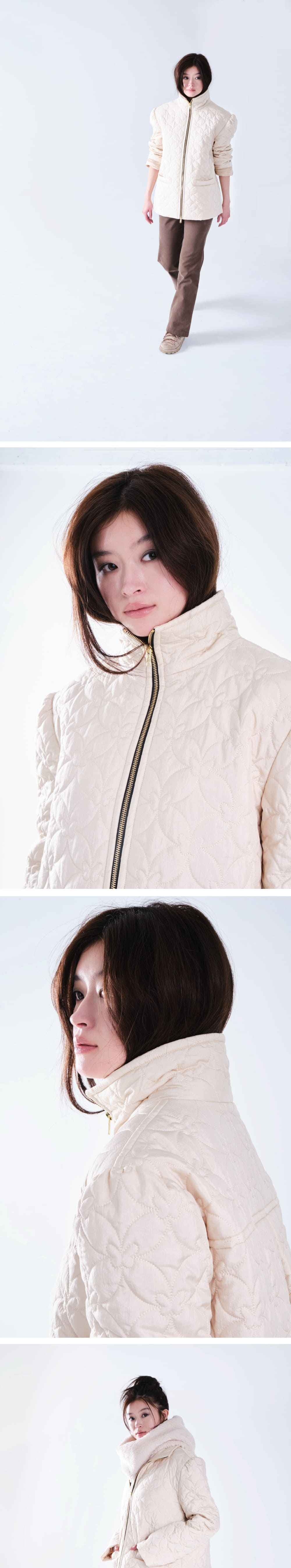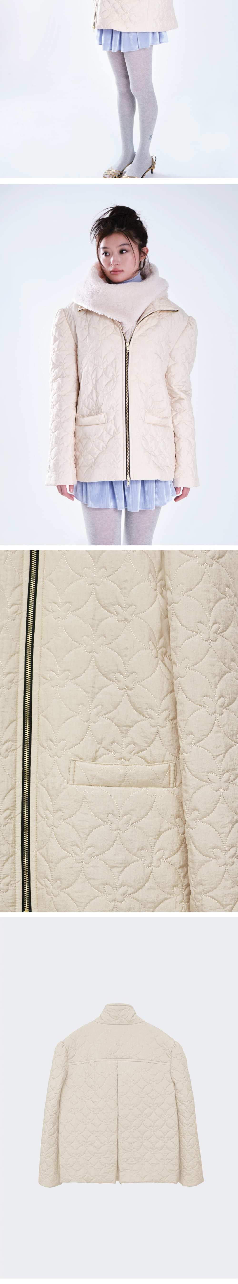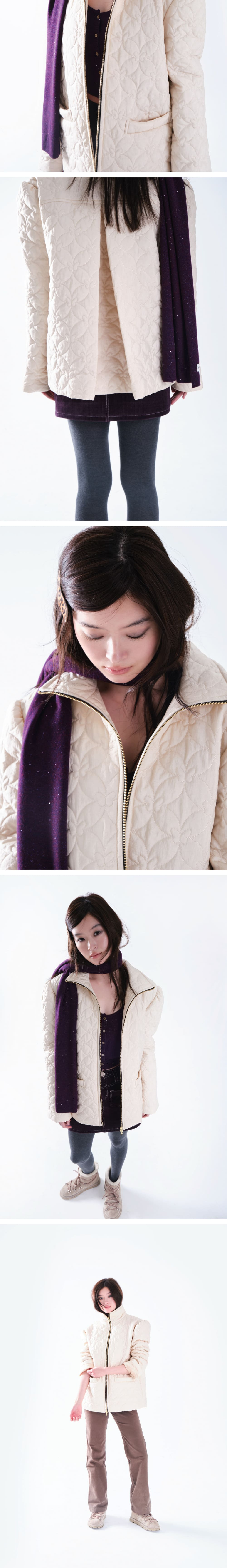 • 나비버스에서 개발한 나비 모양의 퀼팅 자수와 은은한 펄감의 원단 • 두꺼운 이너들과 입어도 괜찮을 정도의 넉넉한 실루엣을 고려한 충전재 두께와 사이즈 • 네크까지 채워지는 금속 투웨이 지퍼 • 소매 부분의 잔잔한 셔링 디테일 • 뒷면 날개주름 디자인