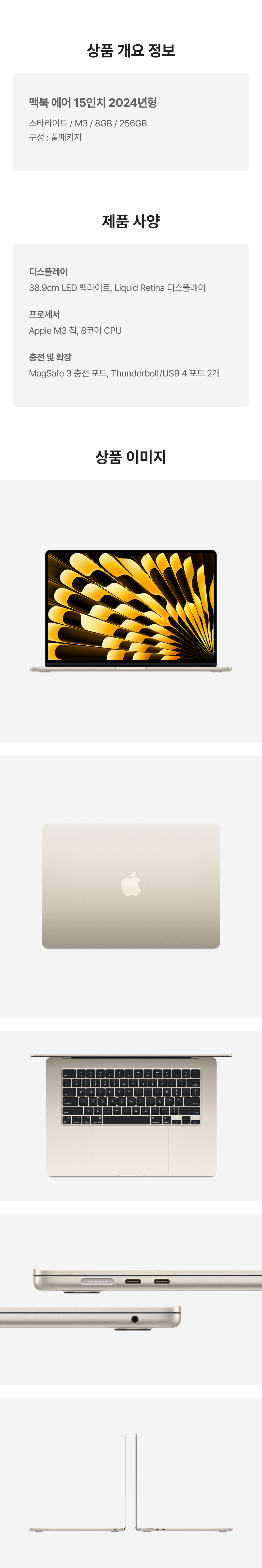 [A등급] 리퍼비시 2024 맥북 에어 15 M3 8c 256기가 SSD 8기가 램 스타라이트
