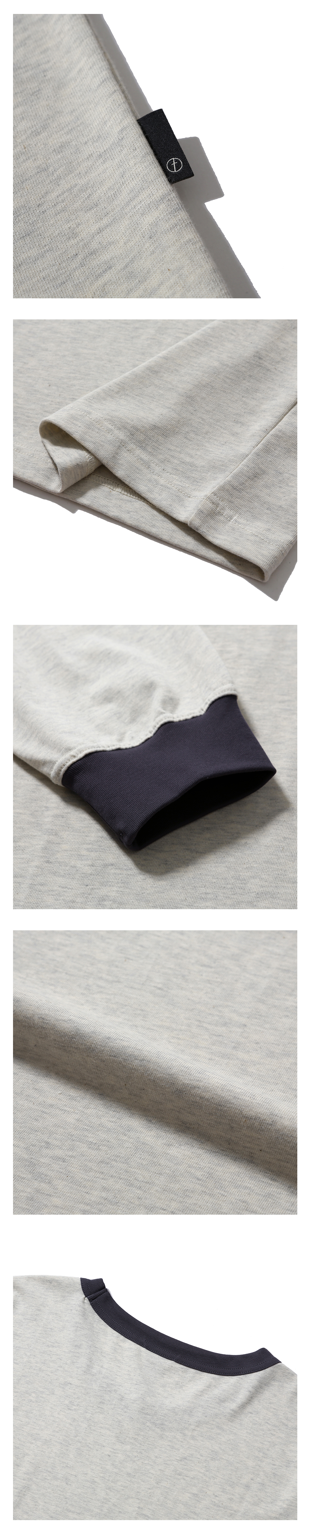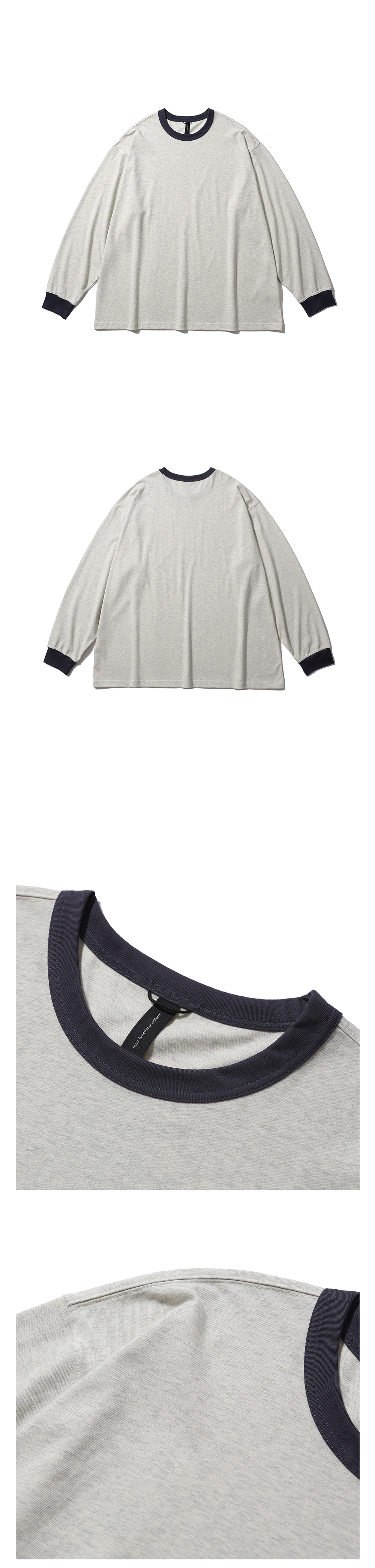 경쾌한 느낌의 긴팔 링거 티셔츠 · 여유 있는 오버사이즈 실루엣. · 골지가 있는 립 오프닝. · 가볍고 부드러우며 표면이 매끈한 면 원단 사용. · 수축 방지 가공된 원단으로 세탁 후에도 변형이 적음. · 립 부분은 배색으로 구성하여 경쾌한 느낌 강조. · 좌측 사이드 심 부분 모이프 심볼 포인트 라벨 부착. · 편안한 착용감을 위해 손목 립 부분의 시접을 갈라서 처리.