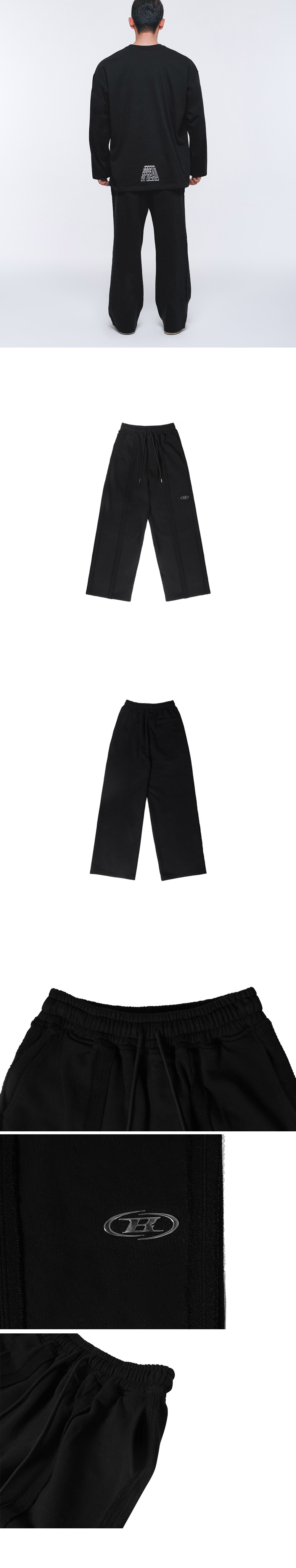 [DETAILS] * 리버스 아웃심 와이드 팬츠 - 헤비테리 코튼 100% 원단 - 아웃커팅 디자인 - 크롬 B 로고 포인트 - 와이드핏 Material : Cotton 100% Fitting : DJ 2 Size, 183cm, 88kg