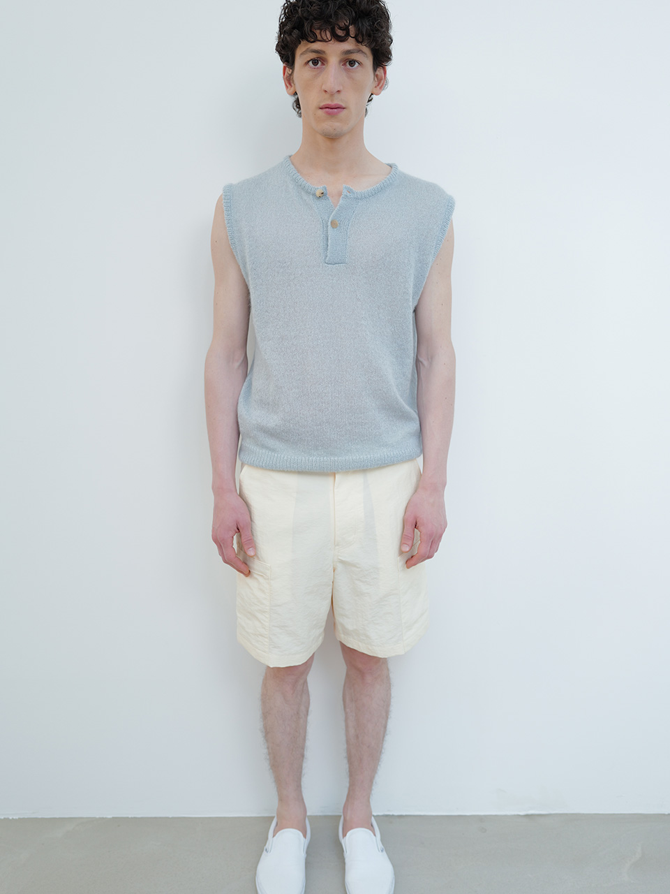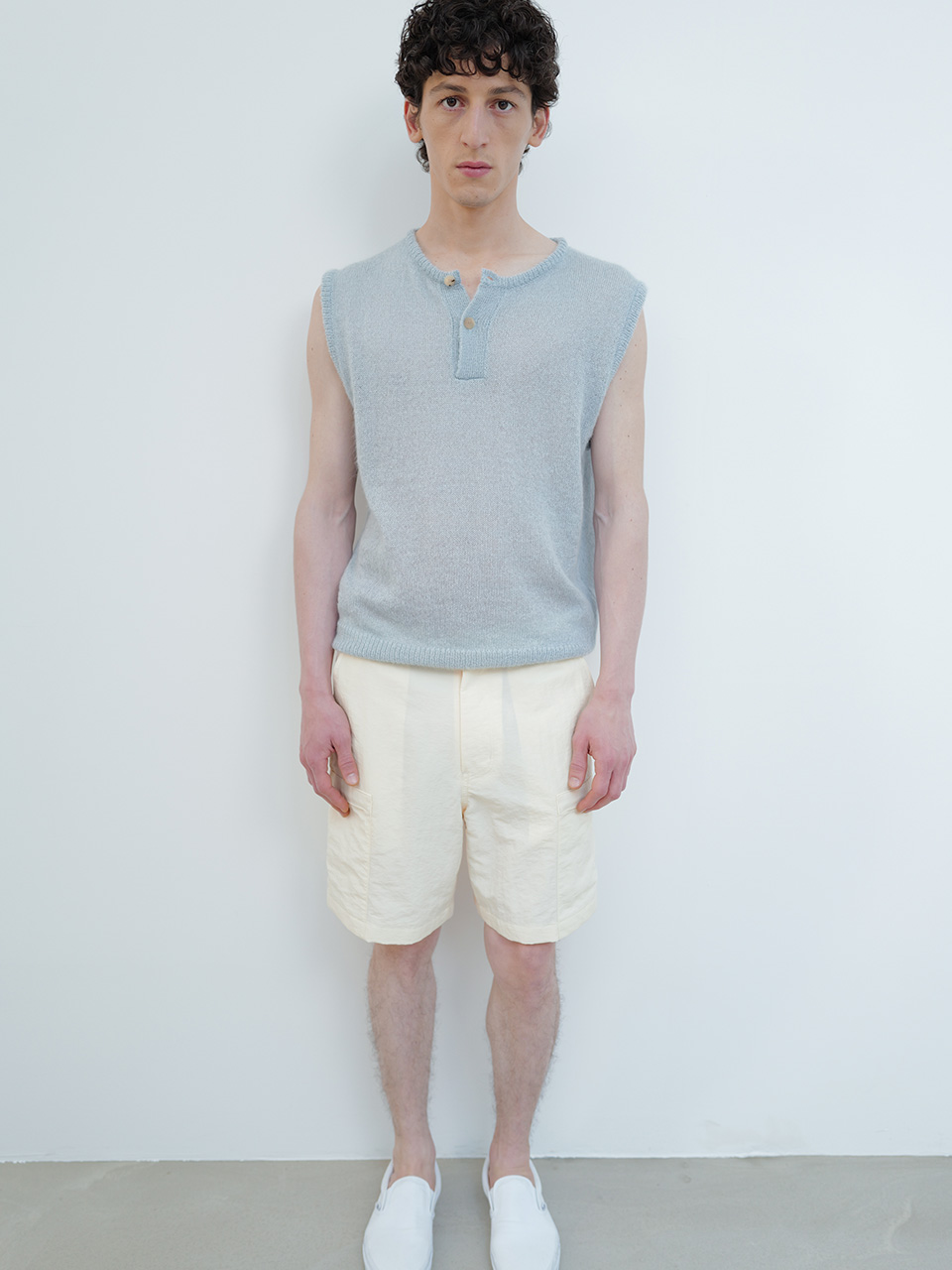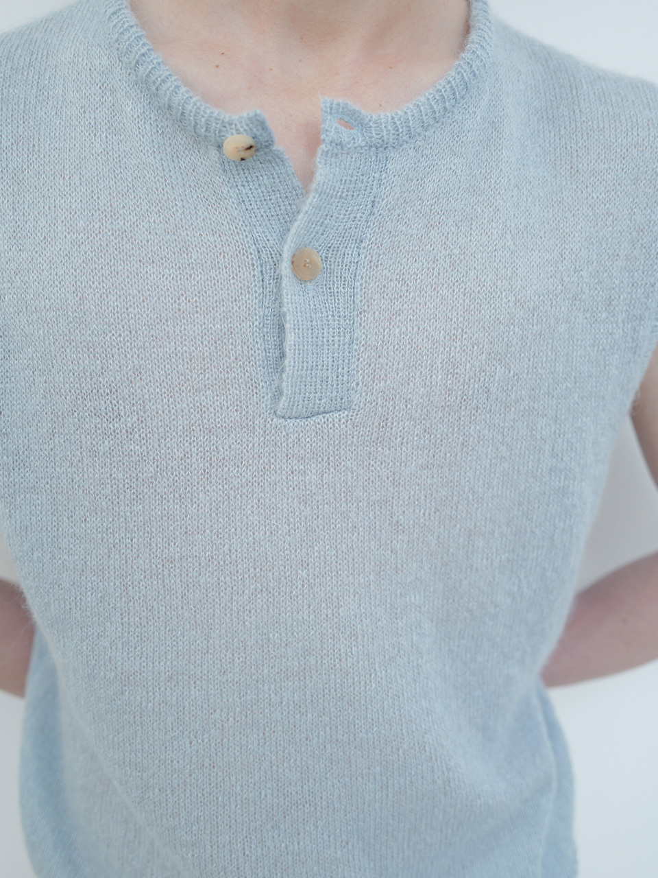이태리 수입사 모헤어 블랜드 소재로 제작된 헨리넥 니트 베스트 제품입니다. 시어하게 편직되어 가벼운 중량감이 특징이며 앞여밈 두개의 소뿔단추로 마무리 되었습니다. 간절기 레이어드 아이템으로 활용도가 높아 오래도록 착용 할 수 있는 에센셜 니트 아이템입니다. *모헤어 특성상 털 빠짐 있을 수 있습니다.* 46 어깨 42CM 가슴 52CM 총장 60.5CM 밑단 33CM 암홀 26CM 48 어깨 45CM 가슴 55CM 총장 62CM 밑단 36CM 암홀 26CM 50 어깨 48CM 가슴 58CM 총장 63.5CM 밑단 39CM 암홀 27CM 치수는 재는 위치에 따라 1-3cm 차이 생길 수 있습니다. 어두운 원단은 염색되었기 때문에 밝은 아이템과 착용 시 주의 부탁드립니다. DRY CLEAN ONLY 180cm 마른체형 모델 48 SIZE 착용