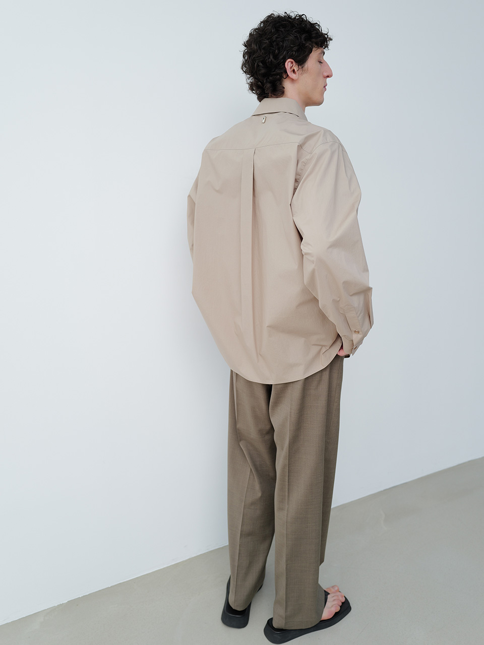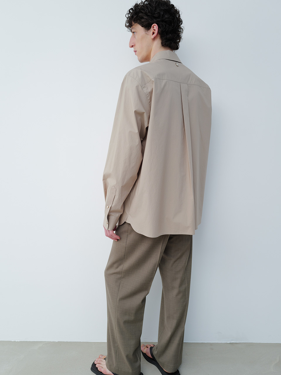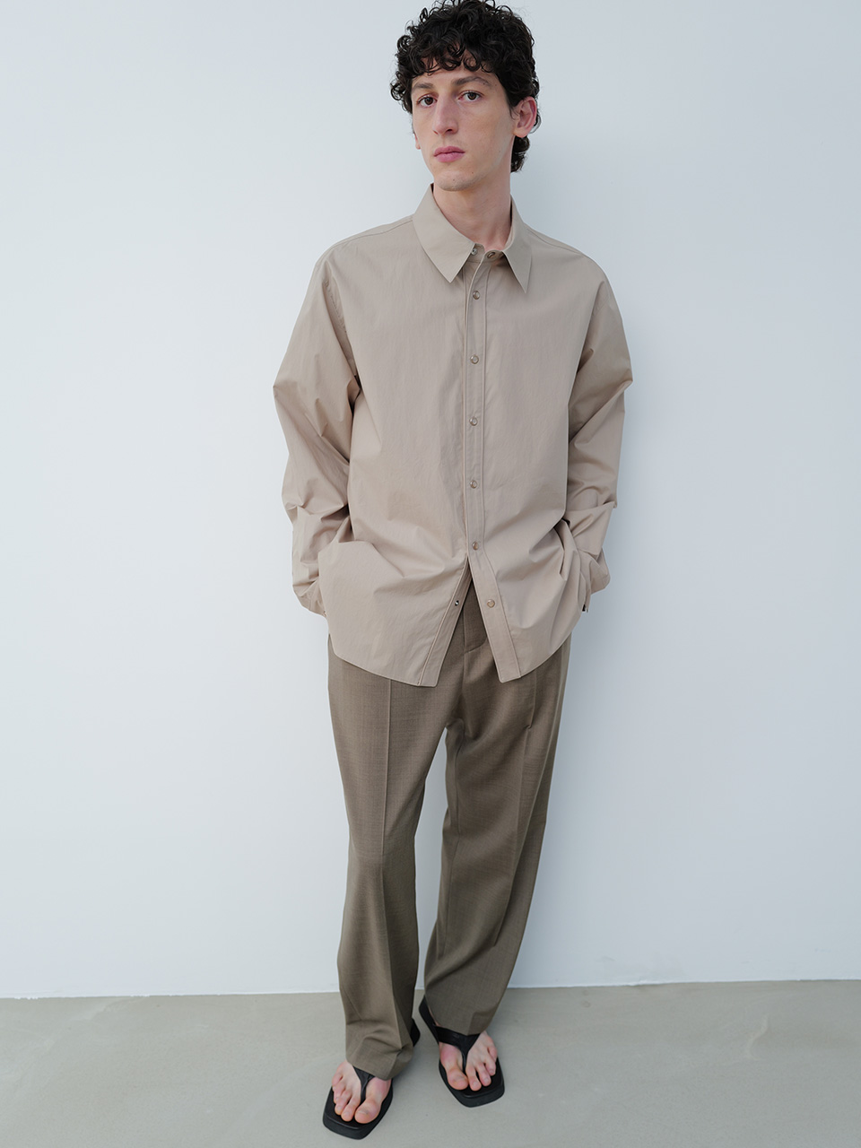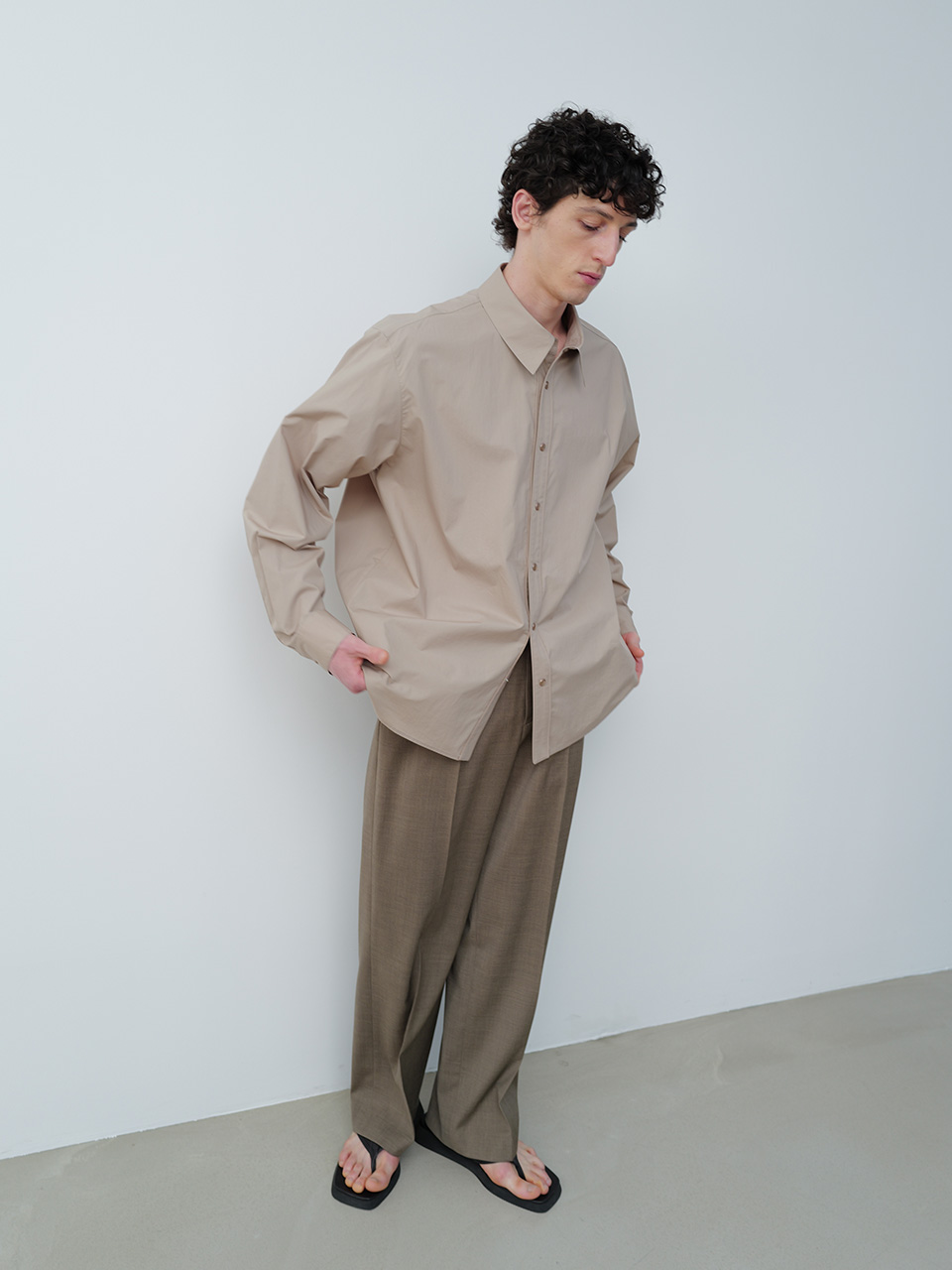 내추럴한 멜란지 조직이 돋보이는 가벼운 울 혼방 원단으로 제작한 팬츠입니다. 베이직한 와이드 스트레이트 핏의 팬츠 디자인으로 프론트에 얕은 턱 디테일이 있으며 제원단 벨트를 활용해 허리 사이즈를 조절하여 착용이 가능합니다. 로고 각인된 소뿔 단추로 마무리하였습니다. TAILORED JACKET와 셋업으로 착용 가능합니다. 46 허리 40.5CM 엉덩이 53.5CM 밑단 25CM 총장 104CM 앞밑위 31.5CM 48 허리 43CM 엉덩이 56CM 밑단 26CM 총장 105CM 앞밑위 32.5CM 50 허리 45.5CM 엉덩이 58.5CM 밑단 27CM 총장 106CM 앞밑위 33.5CM 치수는 재는 위치에 따라 1-3cm 차이 생길 수 있습니다. 어두운 원단은 염색되었기 때문에 밝은 아이템과 착용 시 주의 부탁드립니다. DRY CLEAN ONLY 180cm 마른체형 모델 48 SIZE 착용