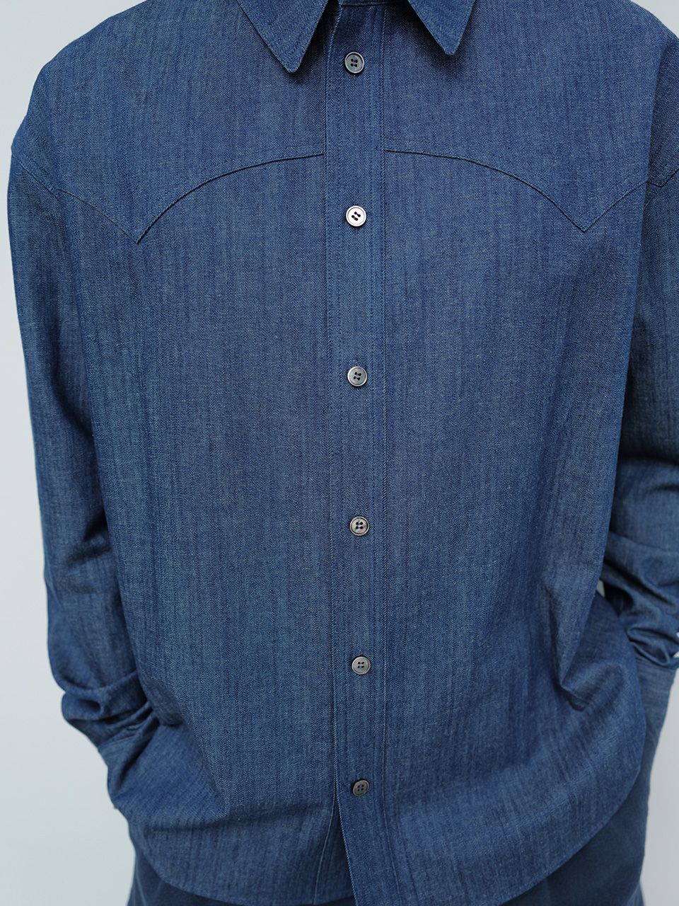 원단 특유의 슬라브 요철감이 돋보이는 데님 원단으로 제작한 셔츠입니다. 박시한 실루엣의 스탠다드 셔츠 디자인으로 프론트의 웨스턴 요크 디테일을 더해 캐주얼하게 착용이 가능합니다. 로고 각인된 자개 단추와 개발한 심볼 금속 장식으로 마무리하였습니다. TWO TUCK WIDE PANTS와 셋업으로 착용 가능합니다. 46 어깨 55CM 가슴 66.5CM 총장 71CM 밑단 65.5CM 소매 64CM 48 어깨 57CM 가슴 69CM 총장 72CM 밑단 68CM 소매 65CM 50 어깨 59CM 가슴 71.5CM 총장 73CM 밑단 70.5CM 소매 66CM 치수는 재는 위치에 따라 1-3cm 차이 생길 수 있습니다. 어두운 원단은 염색되었기 때문에 밝은 아이템과 착용 시 주의 부탁드립니다. DRY CLEAN ONLY 180cm 마른체형 모델 48 SIZE 착용