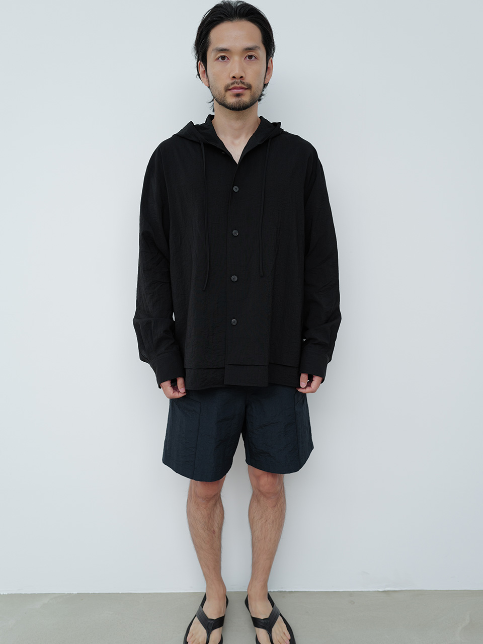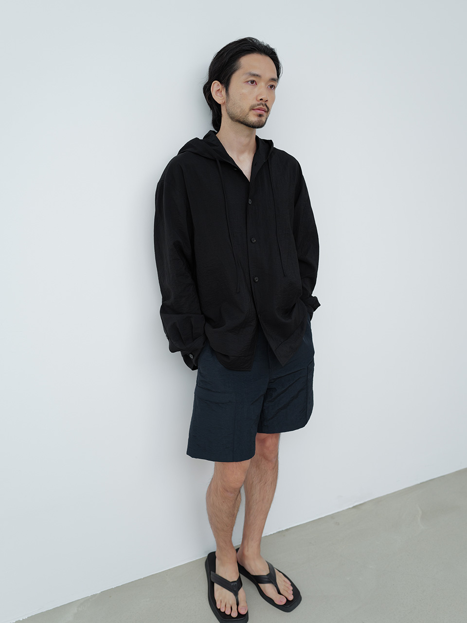 소재 특유의 요철감과 청량감이 특징인 레이온과 나일론 혼방 소재로 제작한 셔츠입니다. 박시한 실루엣의 후드 셔츠 디자인으로 캐주얼하게 연출하기 좋습니다. 후드 입구 스트링을 통해 다양한 실루엣으로 연출이 가능하며 밑단의 더블 레이어드 디테일을 통해 유니크함을 더했습니다. 로고 각인된 소뿔 단추로 마무리하였습니다. 46 어깨 56CM 가슴 60.5CM 총장 72CM 밑단 60.5CM 소매 61CM 48 어깨 58CM 가슴 63CM 총장 73CM 밑단 63CM 소매 62CM 50 어깨 60CM 가슴 65.5CM 총장 74CM 밑단 65.5CM 소매 63CM 치수는 재는 위치에 따라 1-3cm 차이 생길 수 있습니다. 어두운 원단은 염색되었기 때문에 밝은 아이템과 착용 시 주의 부탁드립니다. DRY CLEAN ONLY 180cm 마른체형 모델 48 SIZE 착용