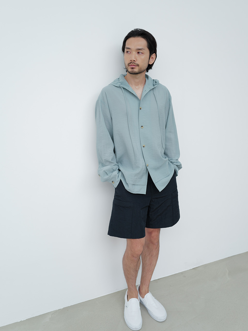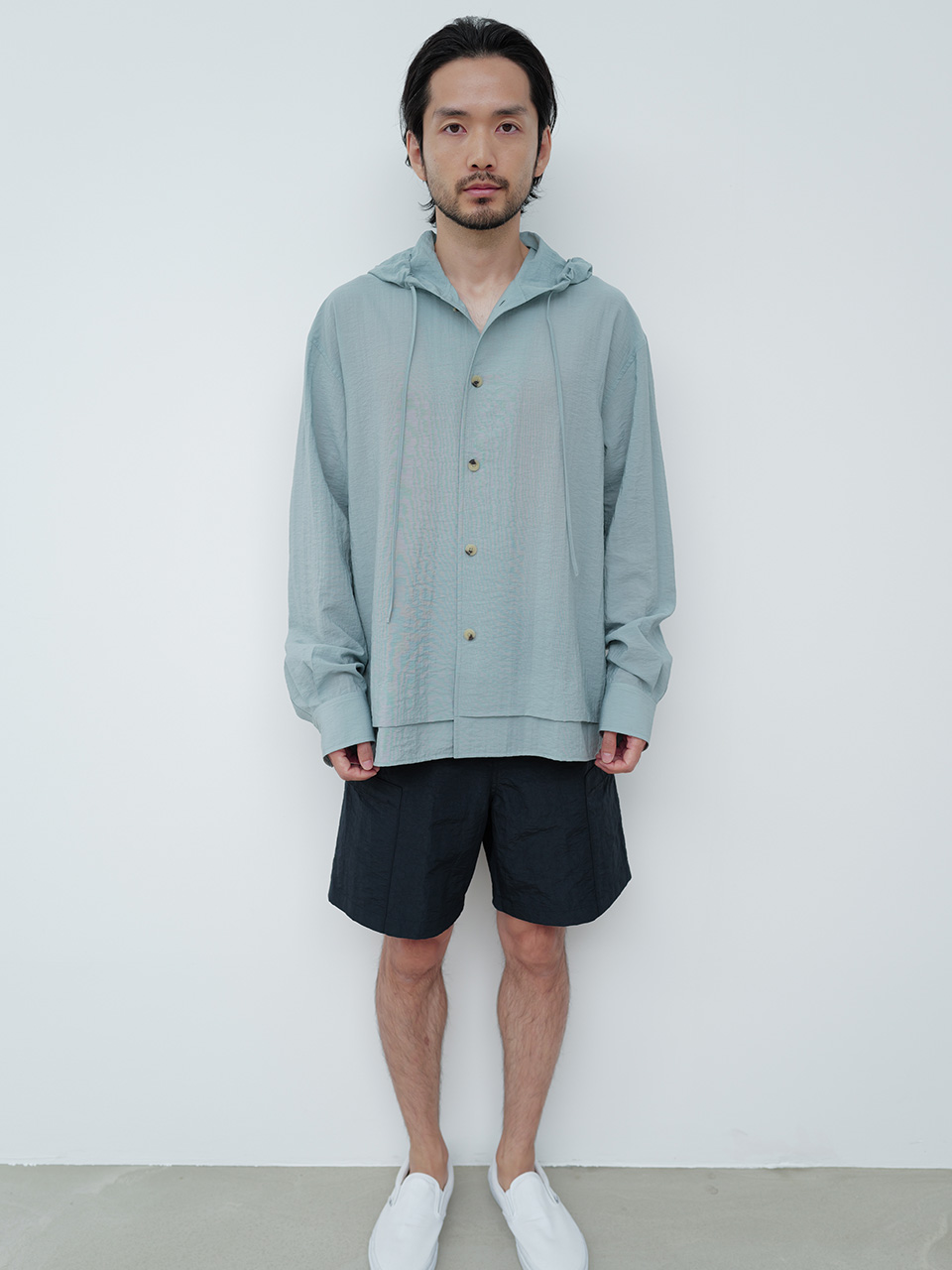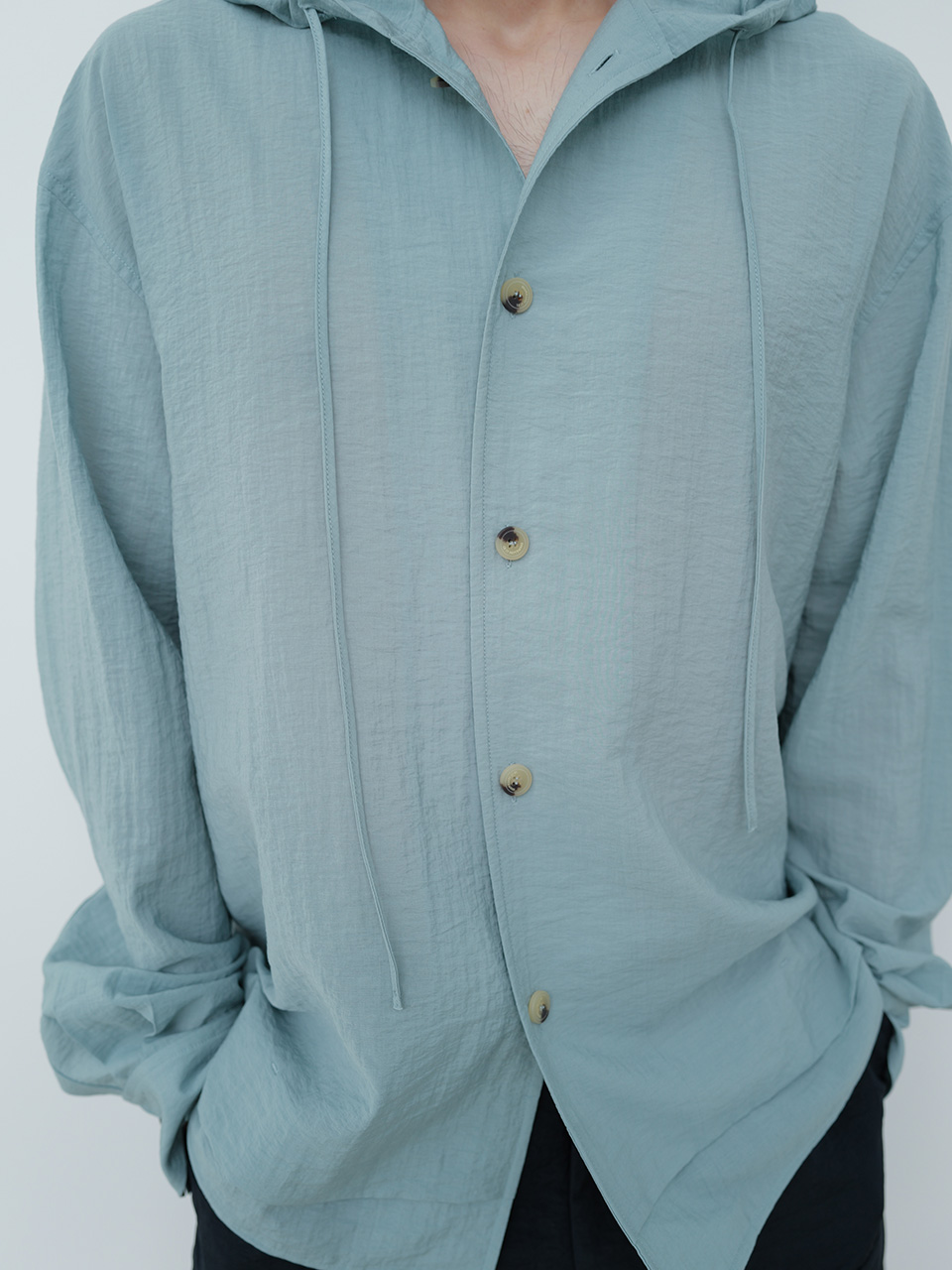 소재 특유의 요철감과 청량감이 특징인 레이온과 나일론 혼방 소재로 제작한 셔츠입니다. 박시한 실루엣의 후드 셔츠 디자인으로 캐주얼하게 연출하기 좋습니다. 후드 입구 스트링을 통해 다양한 실루엣으로 연출이 가능하며 밑단의 더블 레이어드 디테일을 통해 유니크함을 더했습니다. 로고 각인된 지속 가능한 카제인 단추로 마무리하였습니다. 46 어깨 56CM 가슴 60.5CM 총장 72CM 밑단 60.5CM 소매 61CM 48 어깨 58CM 가슴 63CM 총장 73CM 밑단 63CM 소매 62CM 50 어깨 60CM 가슴 65.5CM 총장 74CM 밑단 65.5CM 소매 63CM 치수는 재는 위치에 따라 1-3cm 차이 생길 수 있습니다. 어두운 원단은 염색되었기 때문에 밝은 아이템과 착용 시 주의 부탁드립니다. DRY CLEAN ONLY 180cm 마른체형 모델 48 SIZE 착용