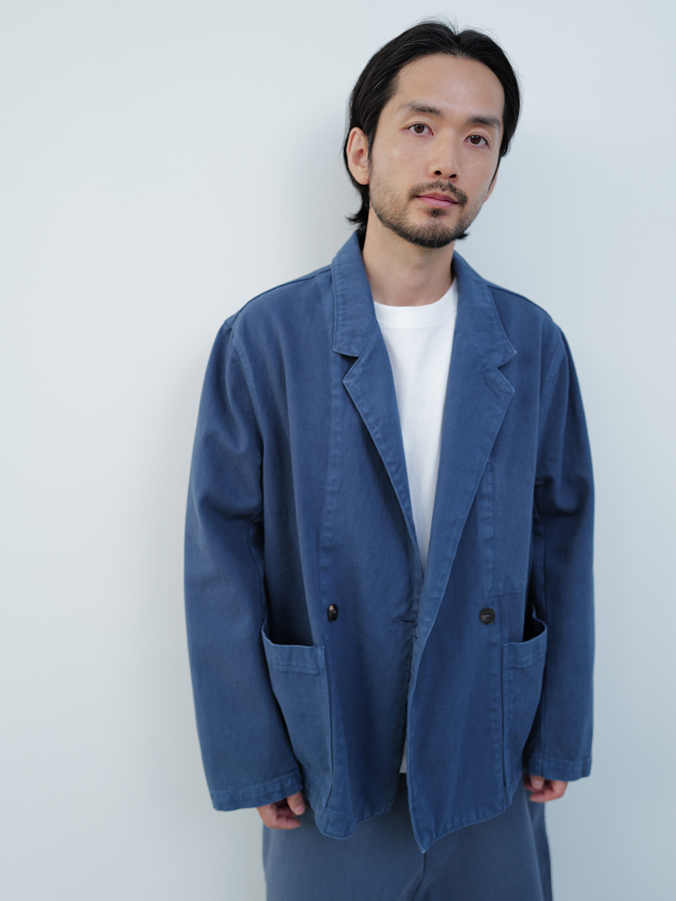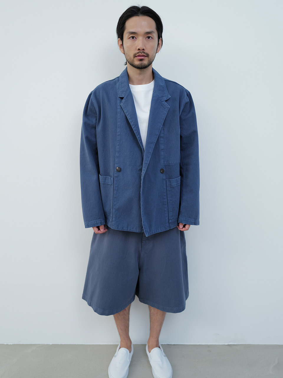 견고한 조직과 부드러운 터치감을 지닌 코튼 원단으로 제작한 데님 자켓입니다. 유니크한 블루 컬러의 오버 다잉 기법을 적용한 캐주얼 더블 브레스티드 자켓 디자인으로, 프론트의 아웃포켓과 안쪽의 히든 포켓 디테일로 포인트를 주었습니다. 로고 각인된 소뿔 단추로 마무리하였습니다. *오버 다잉 가먼트 워싱 공정 특성 상 부자재 이염이 있을 수 있으며 이는 불량 상품이 아닌 점을 안내드립니다* 46 어깨 46CM 가슴 61.5CM 총장 72.5CM 밑단 57.5CM 소매 59CM 48 어깨 48CM 가슴 63CM 총장 73.5CM 밑단 60CM 소매 60CM 50 어깨 50CM 가슴 65.5CM 총장 74.5CM 밑단 62.5CM 소매 61CM 치수는 재는 위치에 따라 1-3cm 차이 생길 수 있습니다. 어두운 원단은 염색되었기 때문에 밝은 아이템과 착용 시 주의 부탁드립니다. DRY CLEAN ONLY 180cm 마른체형 모델 48 SIZE 착용