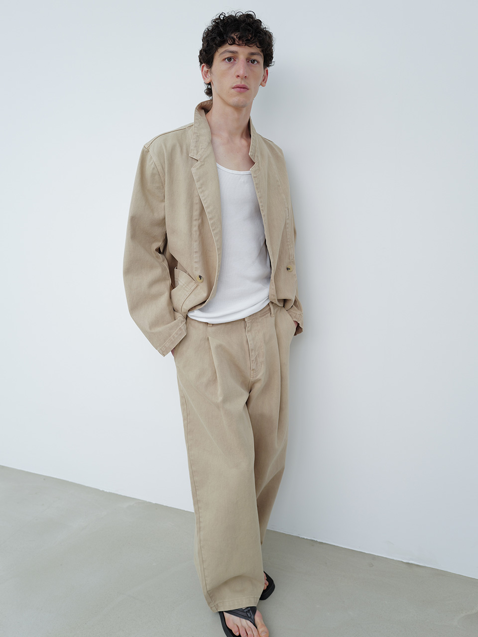 견고한 조직과 부드러운 터치감을 지닌 코튼 원단으로 제작한 데님 자켓입니다. 고급스러운 베이지 컬러의 오버 다잉 기법을 적용한 캐주얼 더블 브레스티드 자켓 디자인으로, 프론트의 아웃포켓과 안쪽의 히든 포켓 디테일로 포인트를 주었습니다. 로고 각인된 지속 가능한 카제인 단추로 마무리하였습니다. *오버 다잉 가먼트 워싱 공정 특성 상 부자재 이염이 있을 수 있으며 이는 불량 상품이 아닌 점을 안내드립니다* 46 어깨 46CM 가슴 61.5CM 총장 72.5CM 밑단 57.5CM 소매 59CM 48 어깨 48CM 가슴 63CM 총장 73.5CM 밑단 60CM 소매 60CM 50 어깨 50CM 가슴 65.5CM 총장 74.5CM 밑단 62.5CM 소매 61CM 치수는 재는 위치에 따라 1-3cm 차이 생길 수 있습니다. 어두운 원단은 염색되었기 때문에 밝은 아이템과 착용 시 주의 부탁드립니다. DRY CLEAN ONLY 180cm 마른체형 모델 48 SIZE 착용