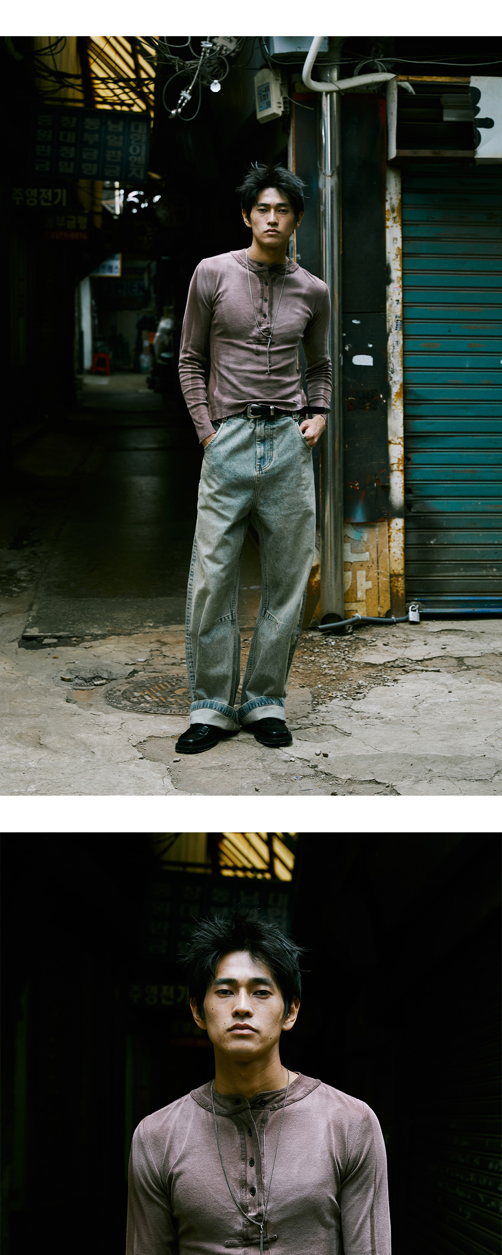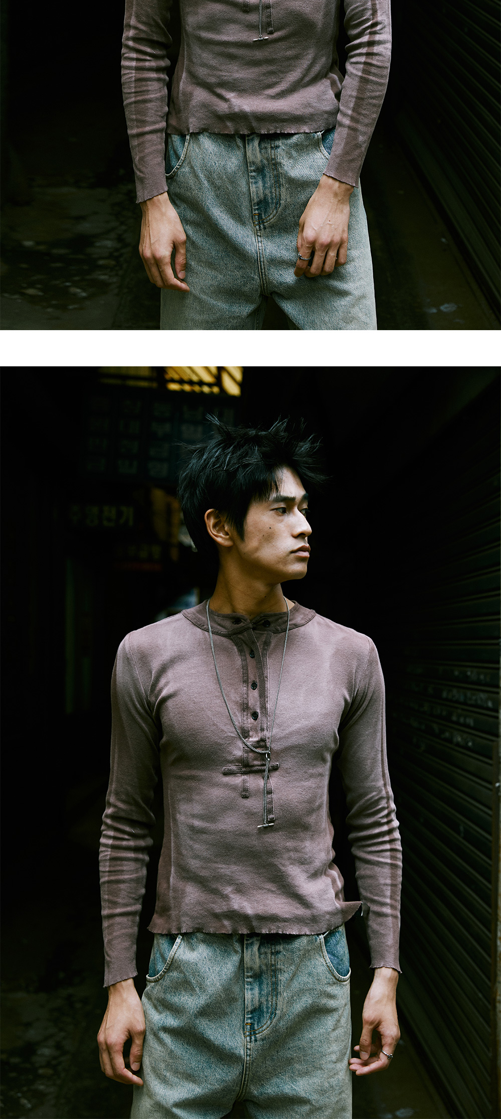 따뜻한 브라운 색감으로 활용도 높은 EDWARD CUMING 라이트 코튼 저지 타이어 트랙 롱 슬리브 헨리 Washed brown입니다. -헨리넥 디자인 -앞판 스티치 디테일
