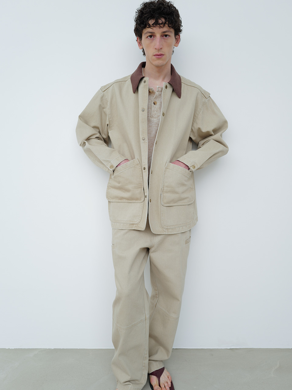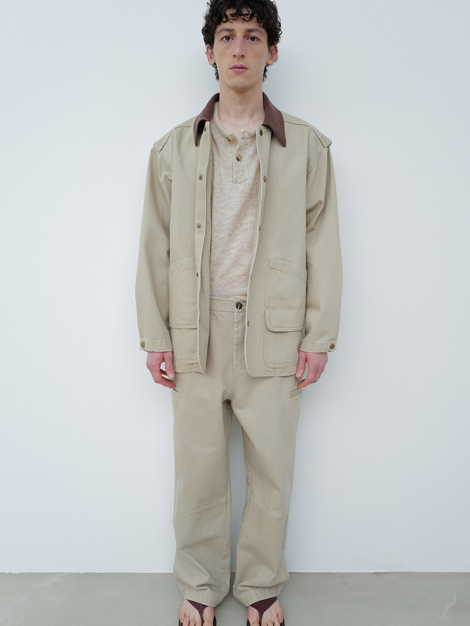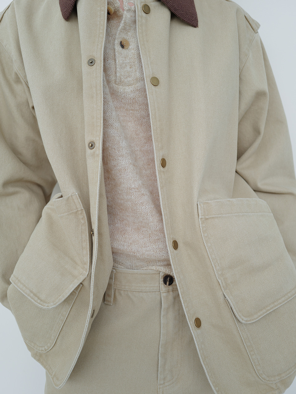 견고한 조직과 고급스러운 트윌 조직이 돋보이는 코튼 원단으로 제작한 자켓입니다. 가먼트 워싱을 통한 부드러운 터치감과 빈티지한 무드가 돋보이는 필드 자켓 디자인으로, 프론트 양쪽에 더블 포켓 디테일과 니트 칼라로 유니크함을 더해 포인트를 주었습니다. 빈티지 골드 스냅과 개발한 심볼 금속 장식으로 마무리하였습니다. WASHED SIDE POCKET PANTS와 셋업으로 착용 가능합니다. 46 어깨 55CM 가슴 60.5CM 총장 77CM 밑단 60.5CM 소매 60CM 48 어깨 57CM 가슴 63CM 총장 78CM 밑단 63CM 소매 61CM 50 어깨 59CM 가슴 65.5CM 총장 79CM 밑단 65.5CM 소매 62CM 치수는 재는 위치에 따라 1-3cm 차이 생길 수 있습니다. 어두운 원단은 염색되었기 때문에 밝은 아이템과 착용 시 주의 부탁드립니다. DRY CLEAN ONLY 180cm 마른체형 모델 48 SIZE 착용
