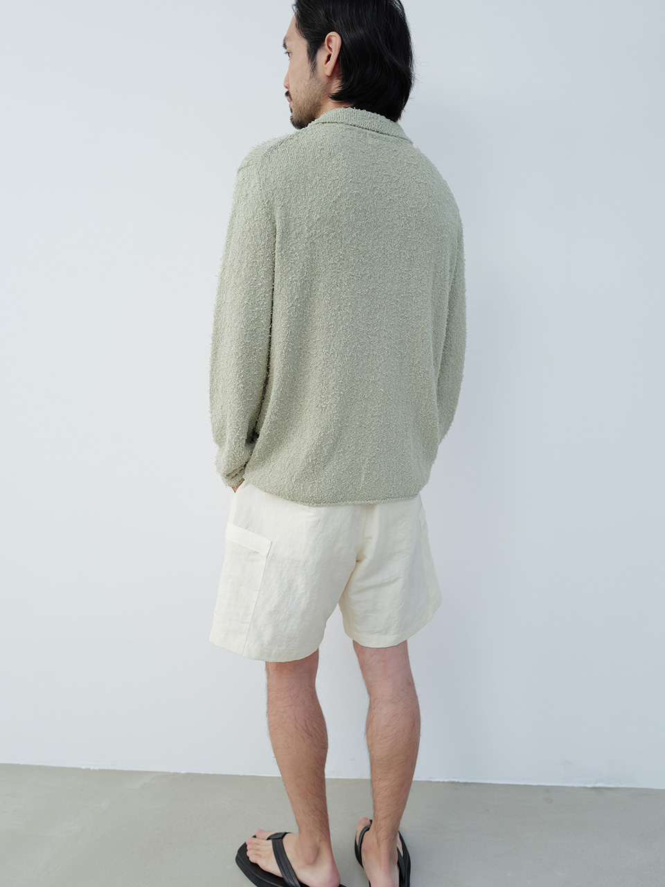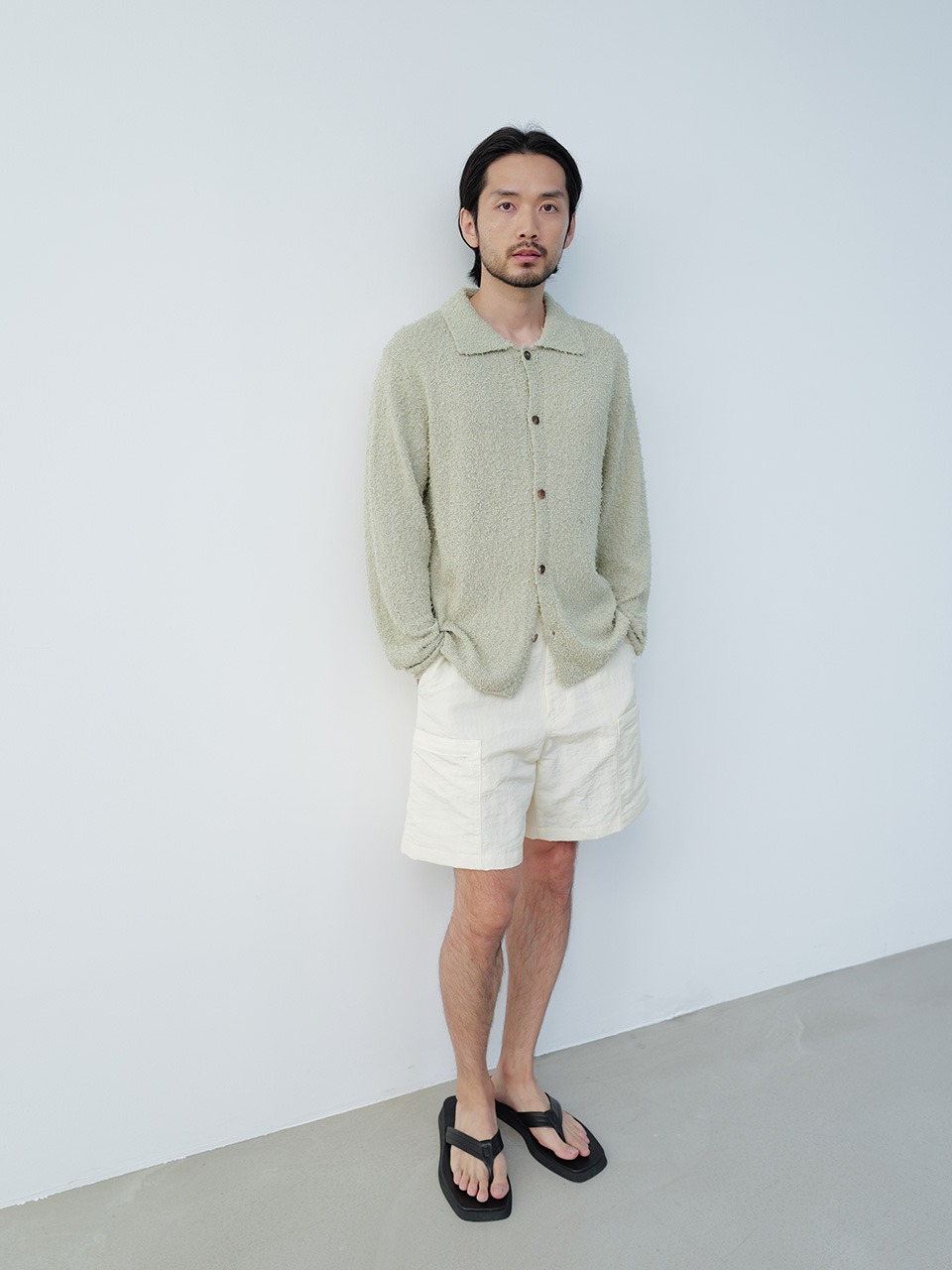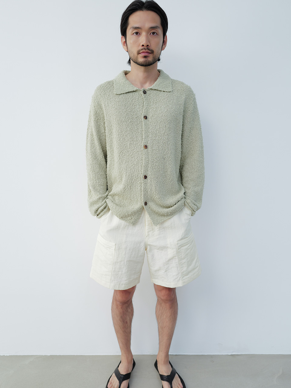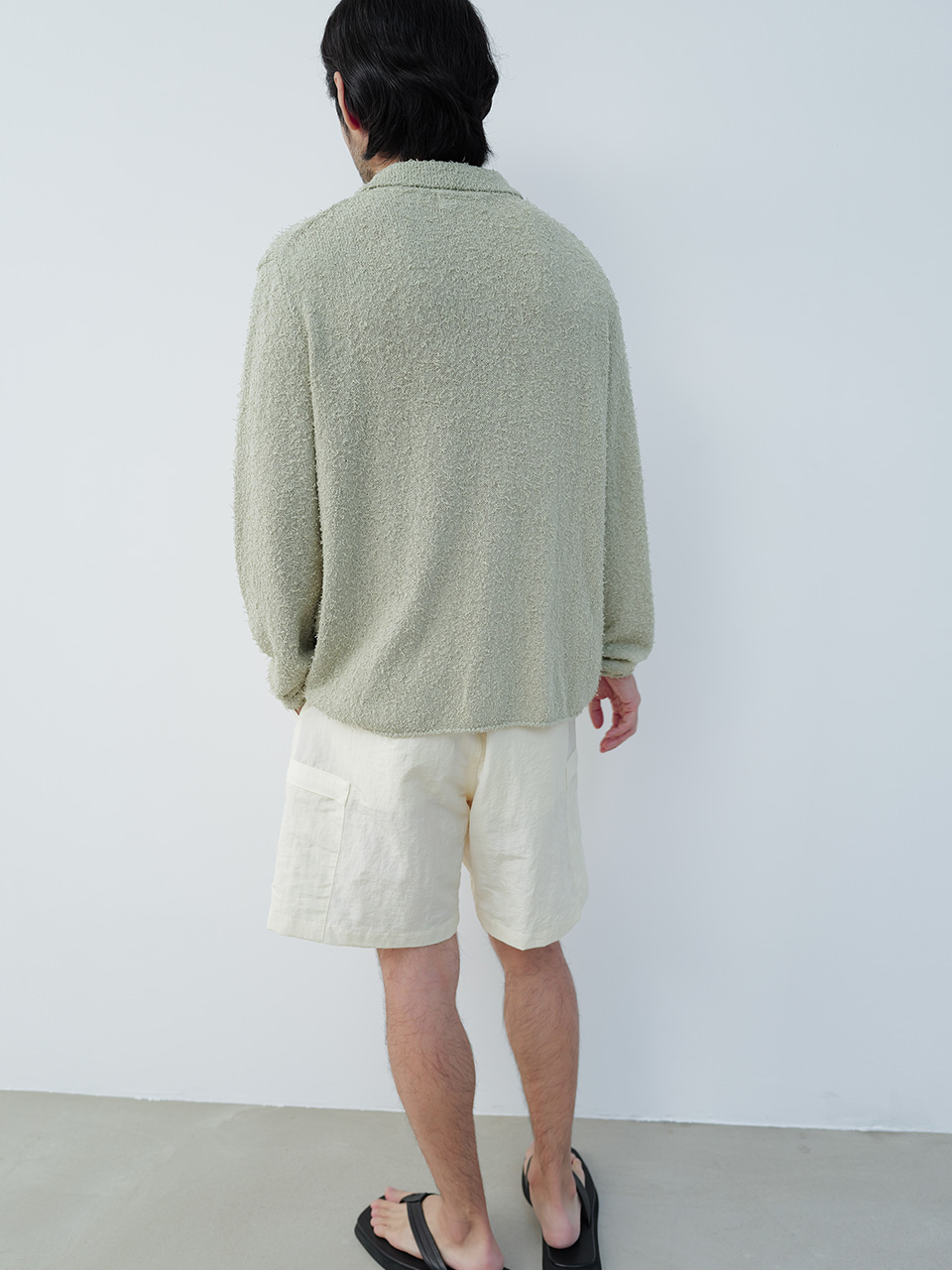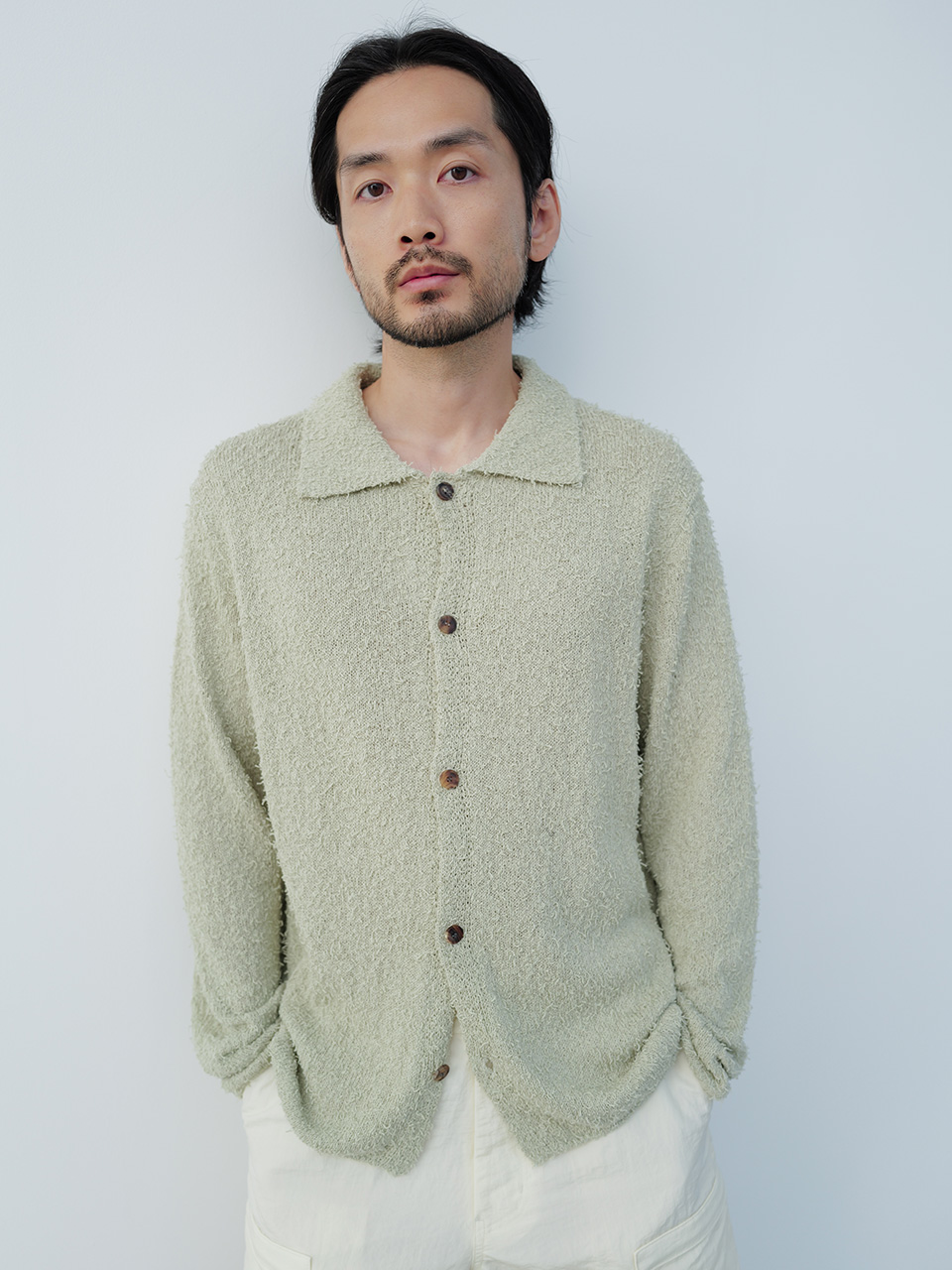 통기성이 높은 코튼 블랜드 소재로 제작된 니트 카라 가디건 제품입니다. 간결한 디자인에 소재에서 느껴지는 독특한 질감의 텍스쳐로 제작되었으며 앞 여밈 단추는 소뿔 단추를 사용하였습니다. 46 어깨 44CM 가슴 55CM 총장 64.5CM 밑단 49CM 암홀 25CM 소매장 61CM 48 어깨 47CM 가슴 58CM 총장 66CM 밑단 52CM 암홀 25CM 소매장 61CM 50 어깨 50CM 가슴 61CM 총장 67.5CM 밑단 55CM 암홀 26CM 소매장 62CM 치수는 재는 위치에 따라 1-3cm 차이 생길 수 있습니다. 어두운 원단은 염색되었기 때문에 밝은 아이템과 착용 시 주의 부탁드립니다. DRY CLEAN ONLY 180cm 마른체형 모델 48 SIZE 착용
