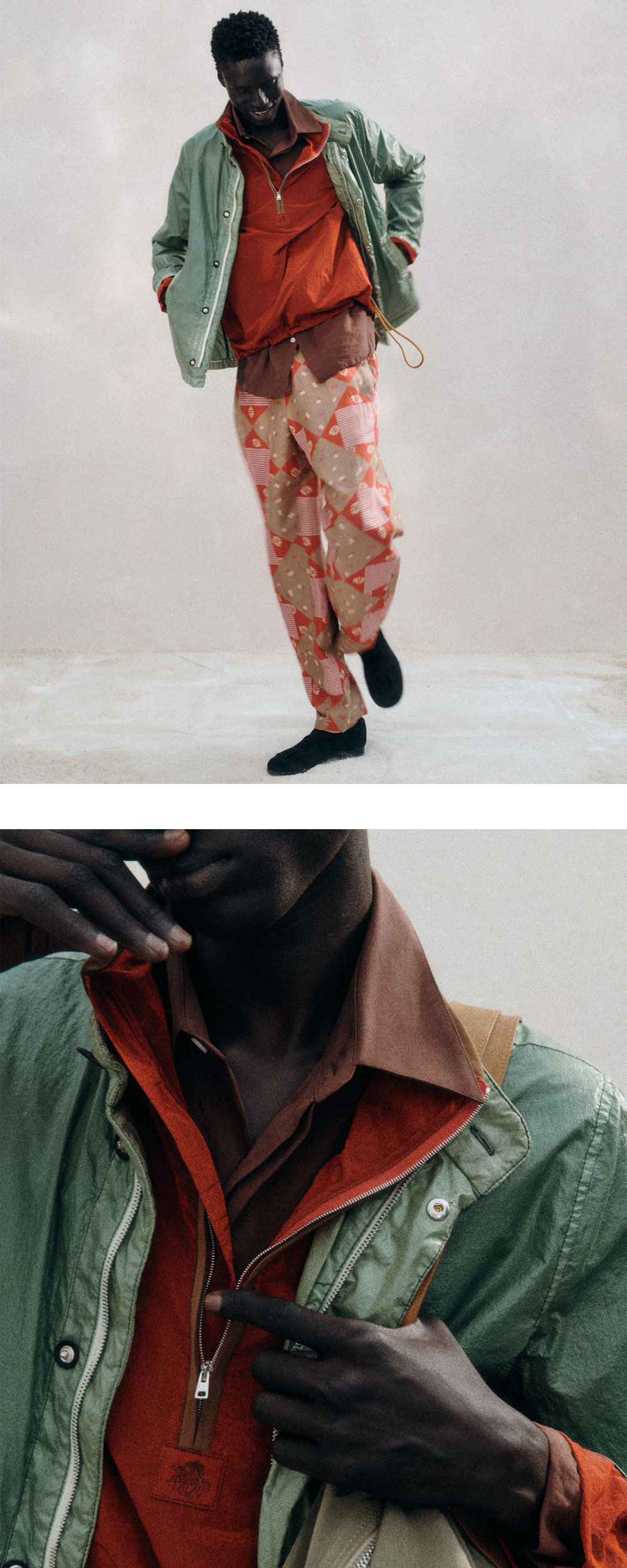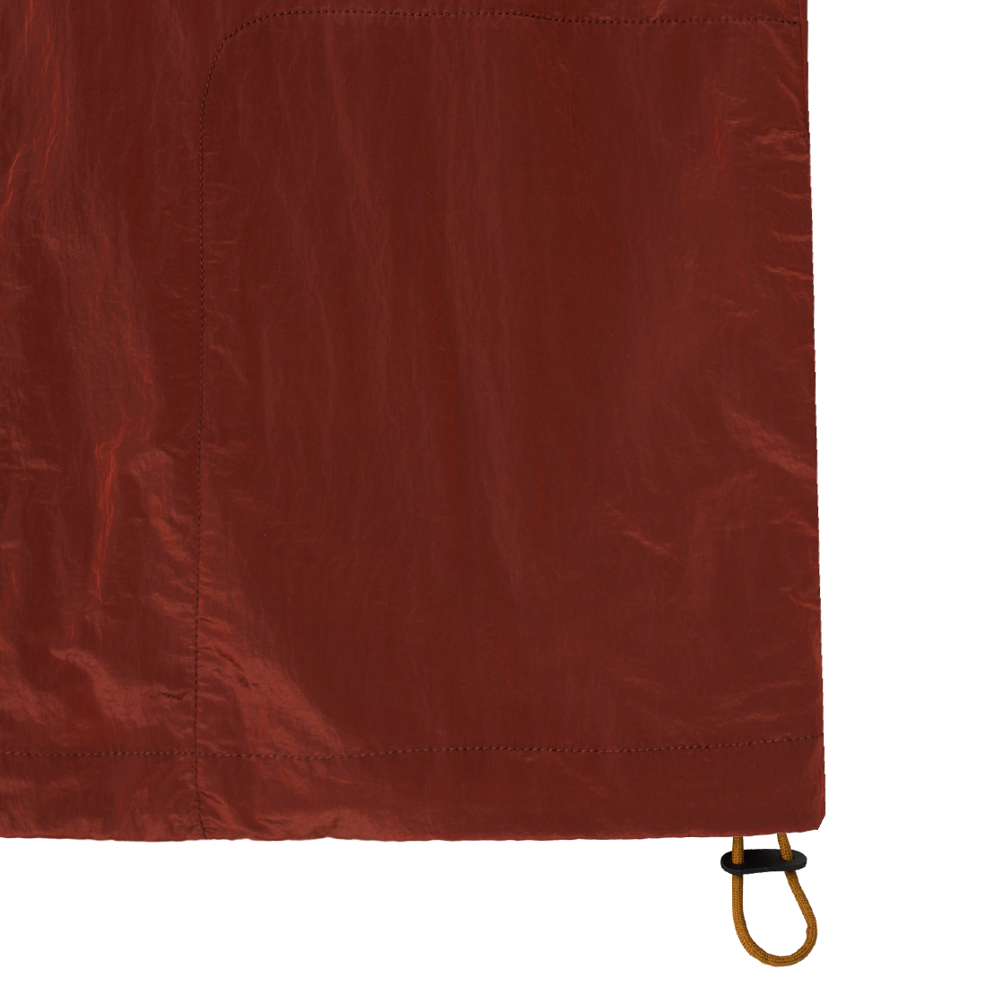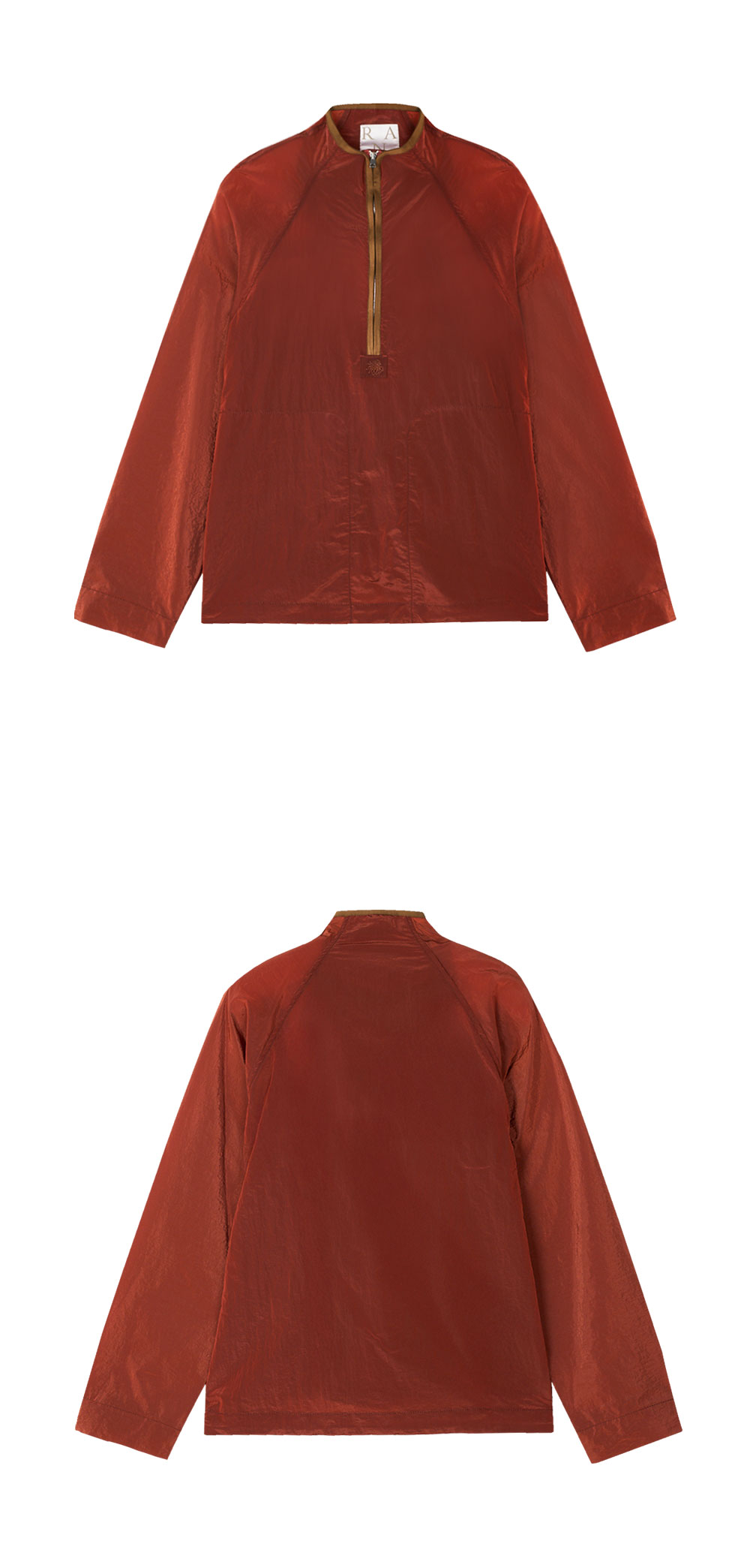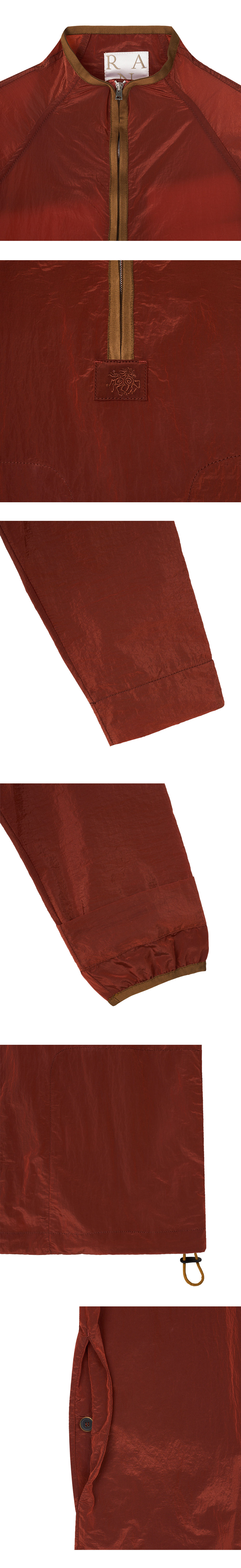 독특한 나일론 원단으로 제작되어 반짝이는 색감이 나타나는 란라의 강가 샤이니 나일론 트랙 탑 로스티드 러셋입니다. -crinkled texture -나일론 소재로 가볍고 뛰어난 내구성 -하프 지퍼 클로저 -중앙의 란라 시그니처 로고 탭 디테일