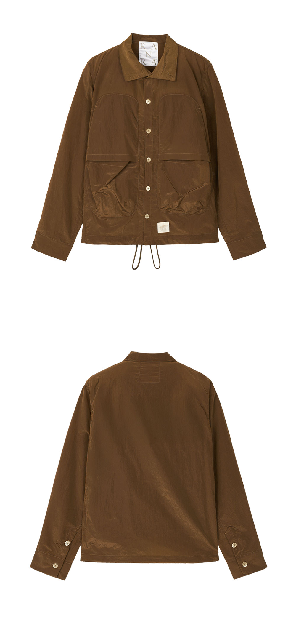 아우터와 셔츠로 모두 활용 가능한 란라의 에피톰 샤이니 나일론 롱슬리브 셔츠 브론즈 브라운입니다. -스프레드 칼라와 스탠드 칼라 모두 가능한 디자인 -버튼 클로저 -패치 포켓 디테일 -밑단 로고 패치 & 히든 드로우스트링