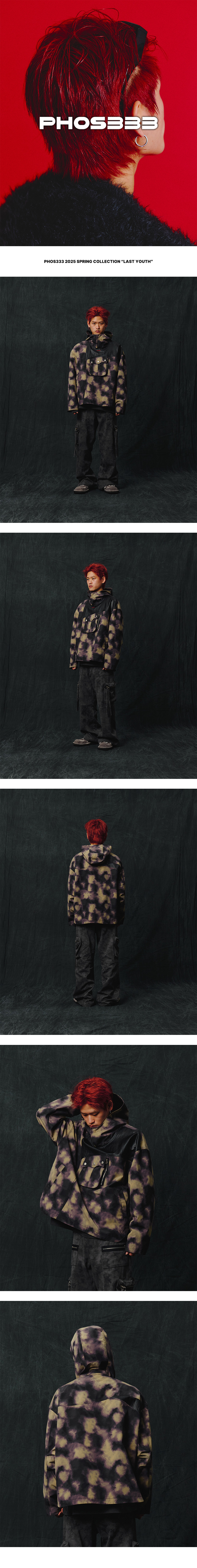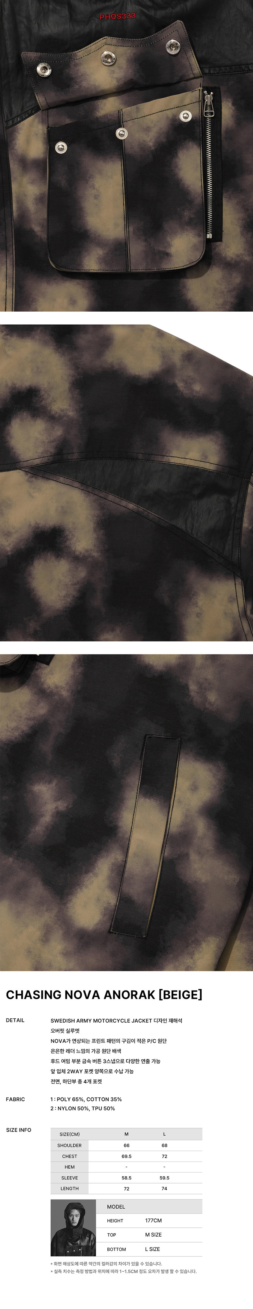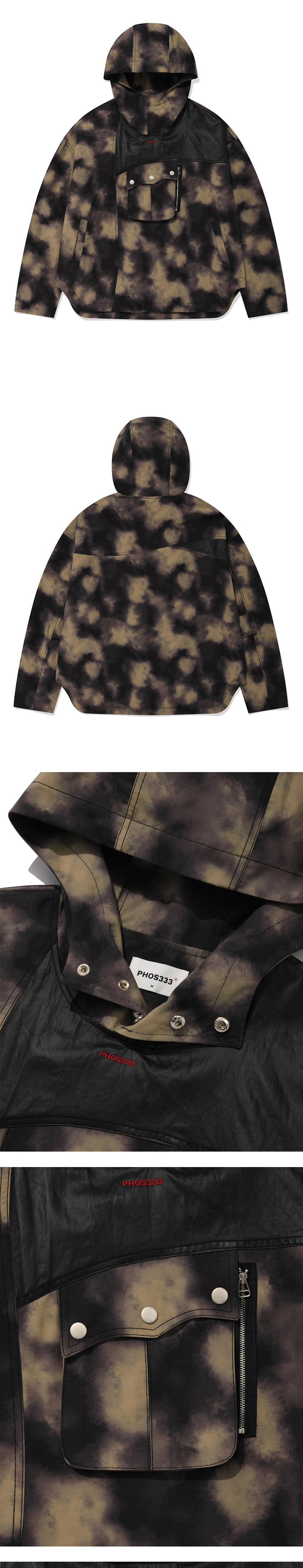 Swedish Army motorcycle jacket 디자인 재해석 오버핏 실루엣 Nova가 연상되는 프린트 패턴의 구김이 적은 P/C 원단 은은한 레더 느낌의 가공 원단 배색 후드 여밈 부분 금속 버튼 3스냅으로 다양한 연출 가능 앞 입체 2way 포켓 양쪽으로 수납 가능 전면, 하단부 총 4개 포켓