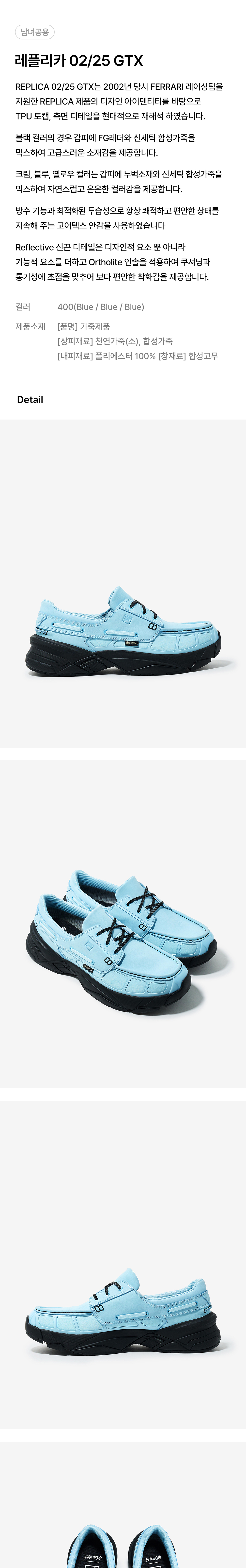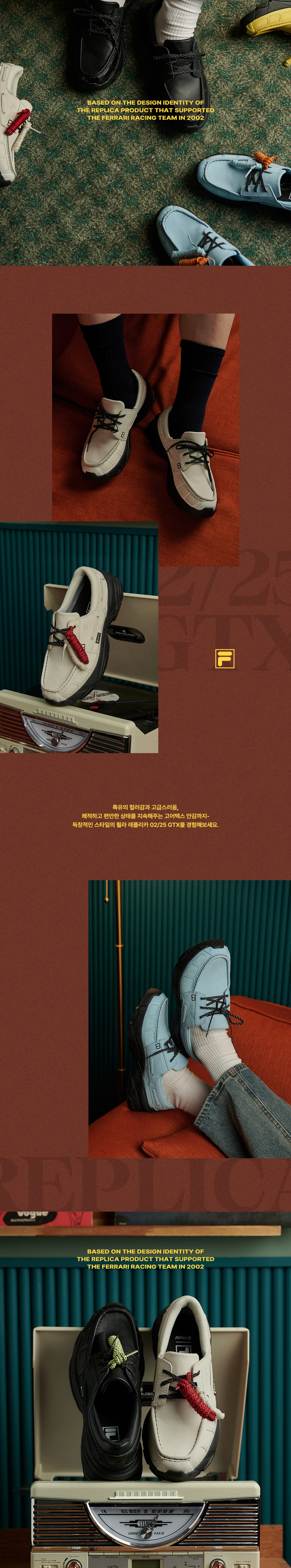 REPLICA 02/25 GTX는 2002년 당시 FERRARI 레이싱팀을 지원한 REPLICA 제품의 디자인 아이덴티티를 바탕으로 TPU 토캡, 측면 디테일을 현대적으로 재해석 하였습니다.블랙 컬러의 경우 갑피 전체에 천연 가죽을 사용했고, 나머지 컬러의 경우 누벅 소재를 사용하여 특유의 컬러감과 고급스러움을 더했으며 완벽한 방수 기능과 최적화된 투습성으로 항상 쾌적하고 편안한 상태를 지속해 주는 고어텍스 안감을 사용하였습니다.Reflective 신끈 디테일은 디자인적 요소뿐 아니라 기능적 요소를 더하고 Ortholite 인솔을 적용하여 쿠셔닝과 통기성에 초점을 맞추어 보다 편안한 착화감을 제공합니다.