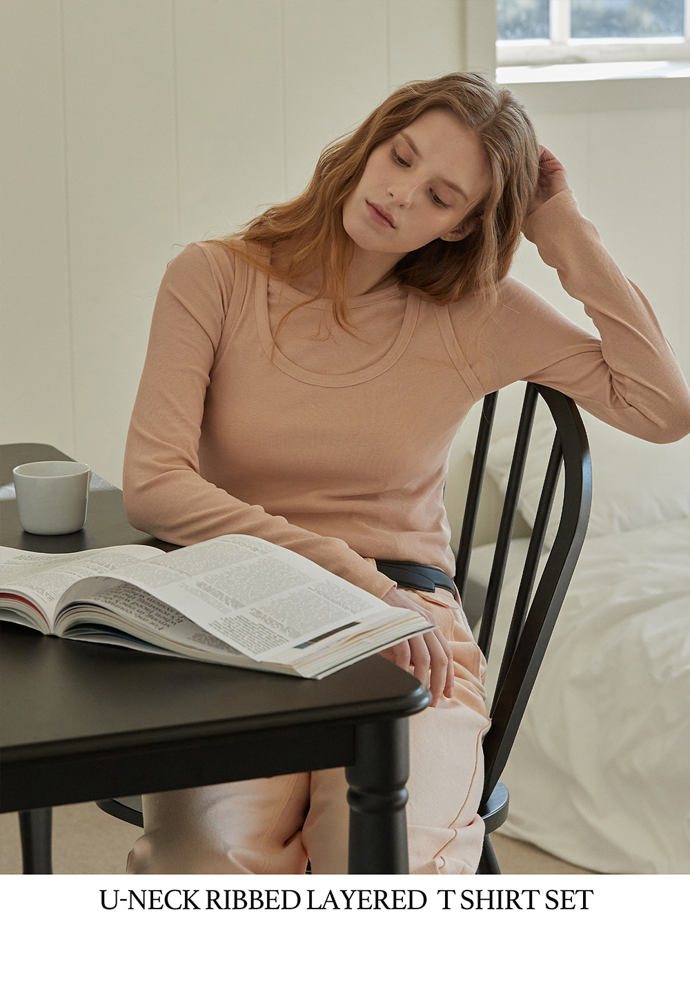 BEMUSE MANSION U-neck ribbed layered t shirt set Salmon Peach