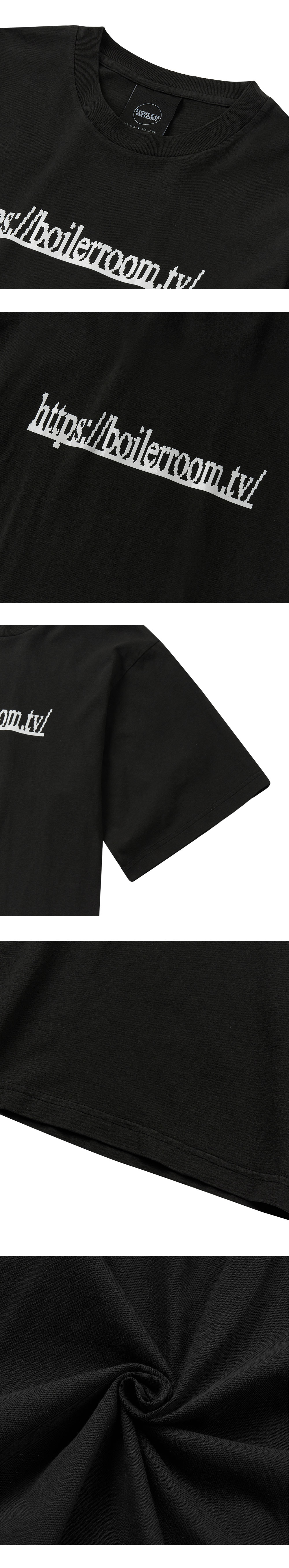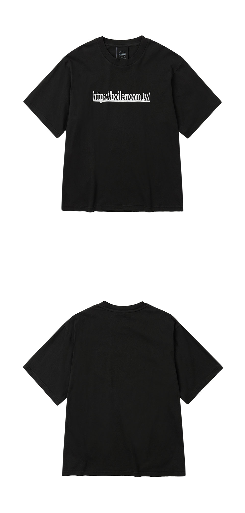 'boilerroom.tv ' 그래픽이 매력적인 보일러룸의 TV 로고 블랙입니다. - 박시한 핏 - 반팔 - 크루넥